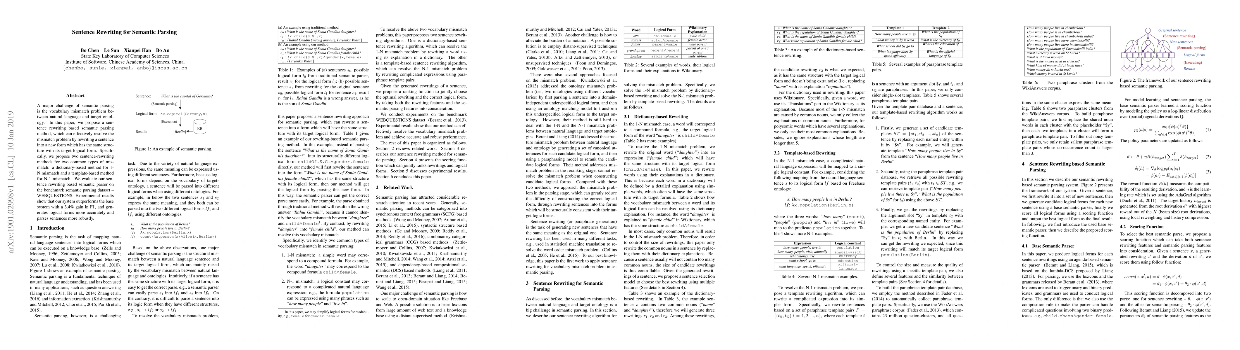 This paper proposes a sentence rewriting method for semantic parsing to resolve vocabulary mismatches between natural language and target ontology. It introduces two methods—dictionary-based for 1-N mismatch and template-based for N-1 mismatch—to transform sentences into their logical forms, achieving a 3.4% F1 score improvement over the base system.