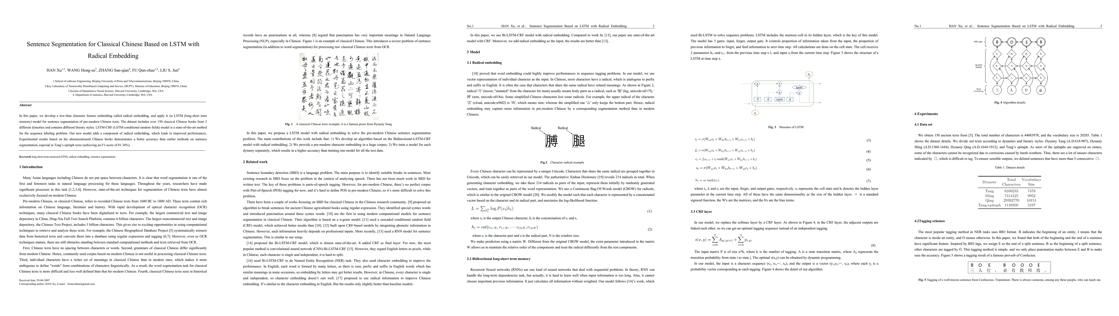 This paper introduces a radical embedding feature for an LSTM model to improve sentence segmentation in classical Chinese texts. The model outperforms previous methods, especially in Tang Epitaph texts, as shown by experiments on over 150 books from three different dynasties.