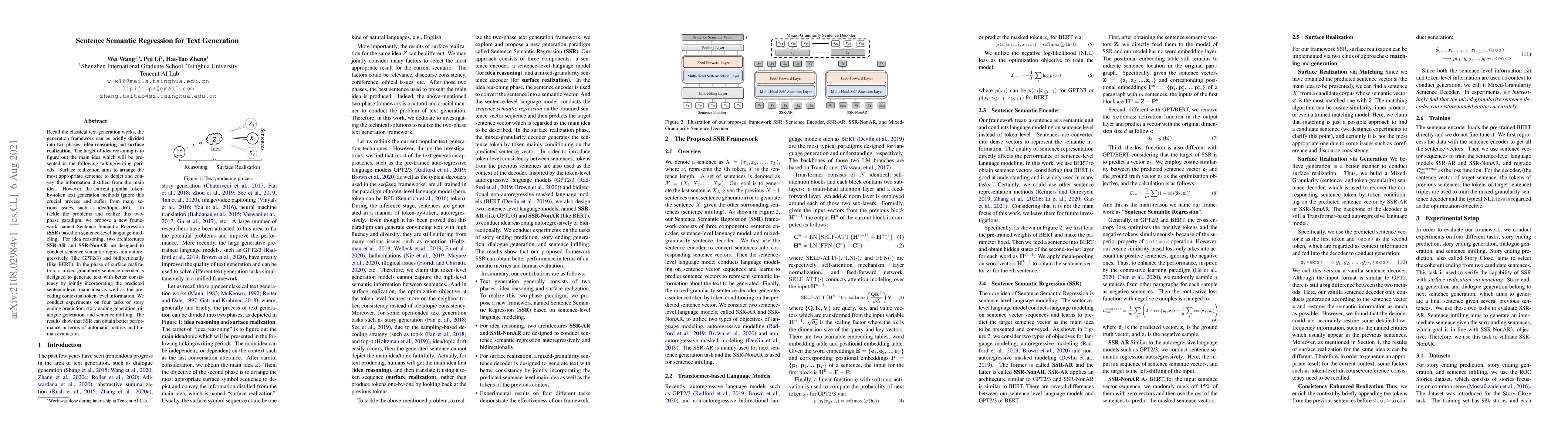 This research paper proposes a new text generation framework called Sentence Semantic Regression (SSR) that separates idea reasoning from surface realization, achieving better performance in story ending prediction, dialogue generation, and sentence infilling.