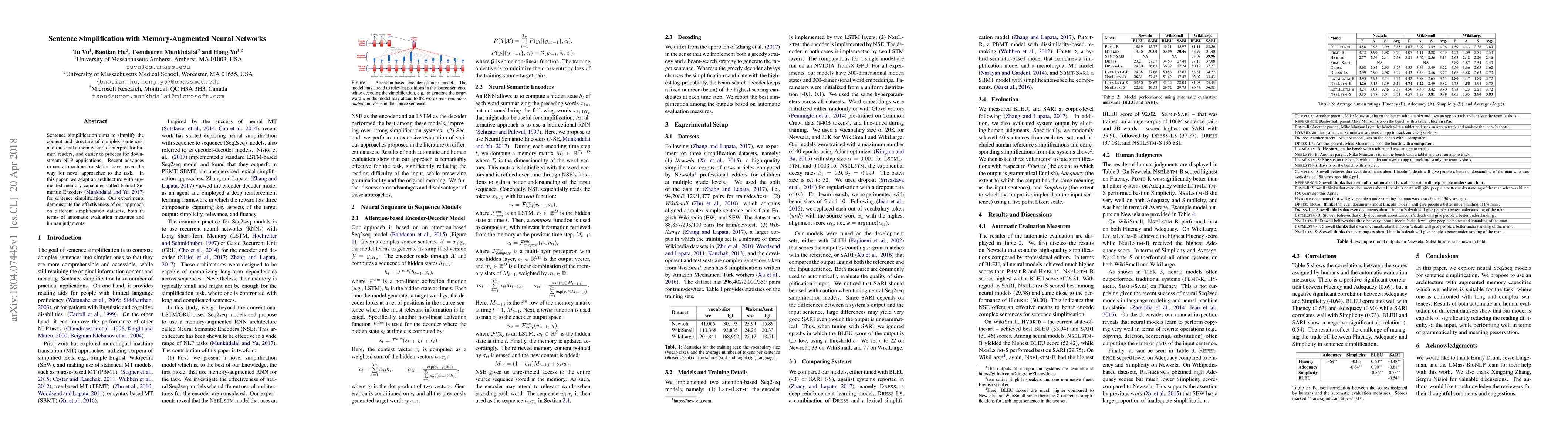 This paper adapts Neural Semantic Encoders with augmented memory for sentence simplification, showing improved performance on various datasets through both automatic metrics and human evaluations.