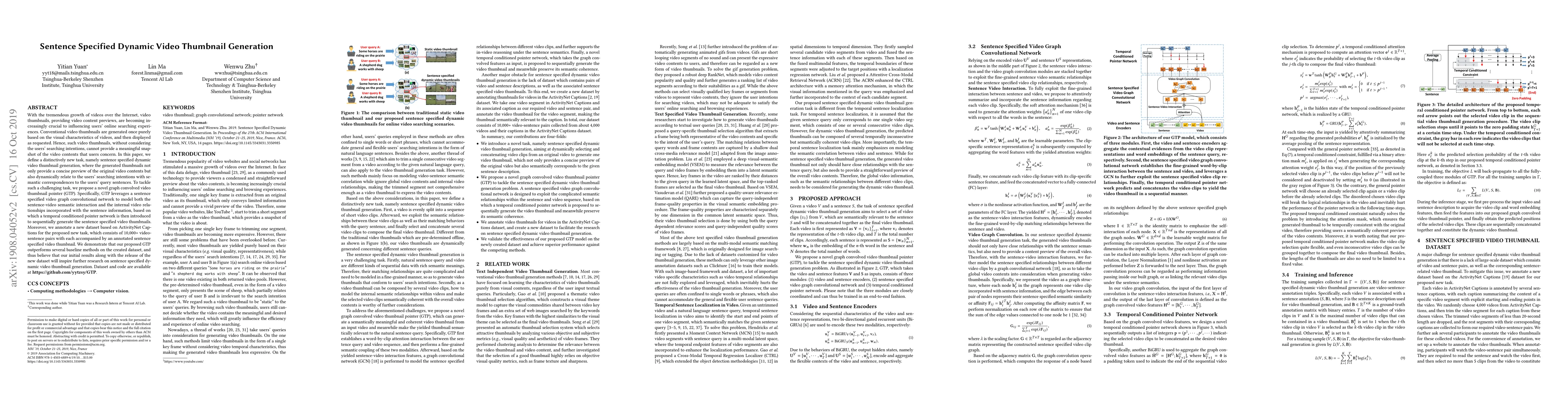 This paper introduces a novel task of generating sentence specified dynamic video thumbnails that align with users' search intentions. The proposed Graph Convolution Thumbnail Pointer (GTP) leverages a sentence-video semantic interaction and internal video relationships to create thumbnails that dynamically reflect the content relevant to user queries. A new dataset with over 10,000 video-sentence pairs and annotated thumbnails is also introduced, demonstrating the effectiveness of the proposed method.