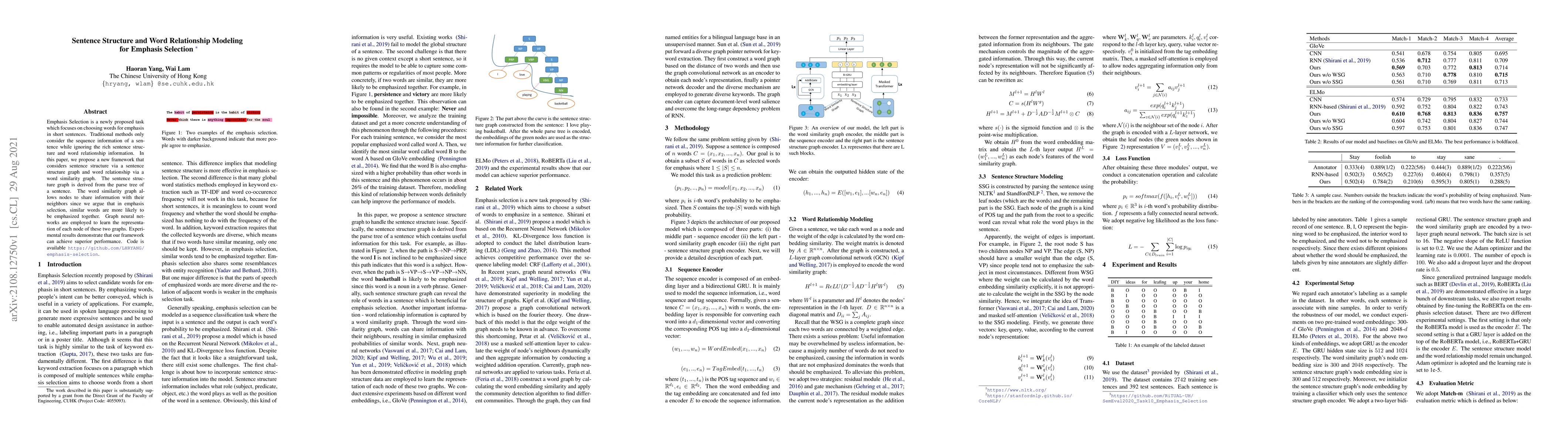 Emphasis Selection is a newly proposed task which focuses on choosing words for emphasis in short sentences. Traditional methods only consider the sequence information of a sentence while ignoring the rich sentence structure and word relationship information. In this paper, we propose a new framework that considers sentence structure via a sentence structure graph and word relationship via a word similarity graph. The sentence structure graph is derived from the parse tree of a sentence. The word similarity graph allows nodes to share information with their neighbors since we argue that in emphasis selection, similar words are more likely to be emphasized together. Graph neural networks are employed to learn the representation of each node of these two graphs. Experimental results demonstrate that our framework can achieve superior performance.