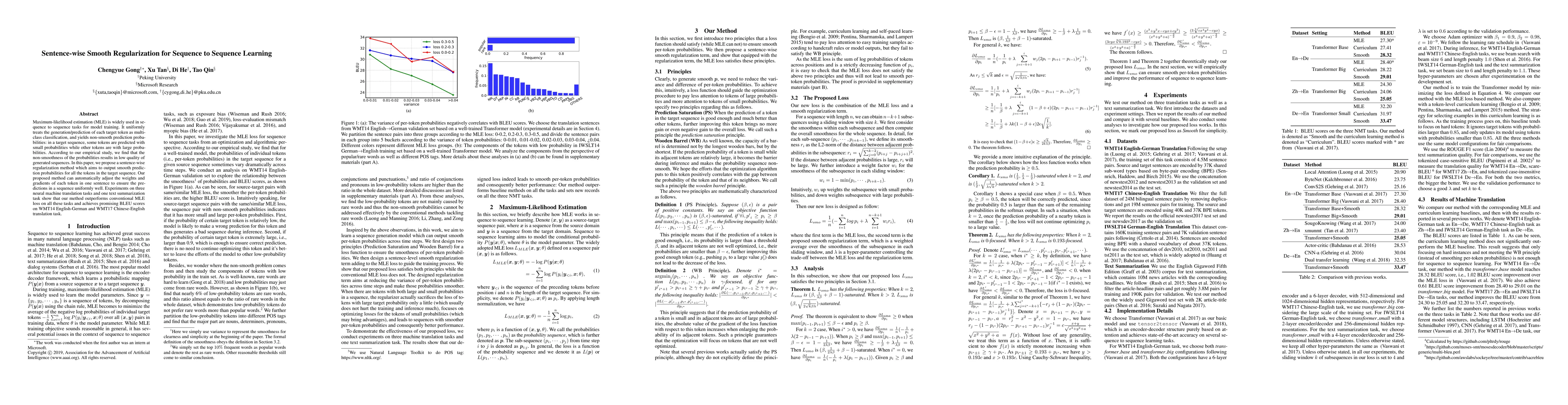 Researchers propose a new regularization method to improve sequence-to-sequence learning models' generation quality by producing smooth prediction probabilities for target tokens. Their approach outperforms conventional maximum-likelihood estimation on multiple tasks.