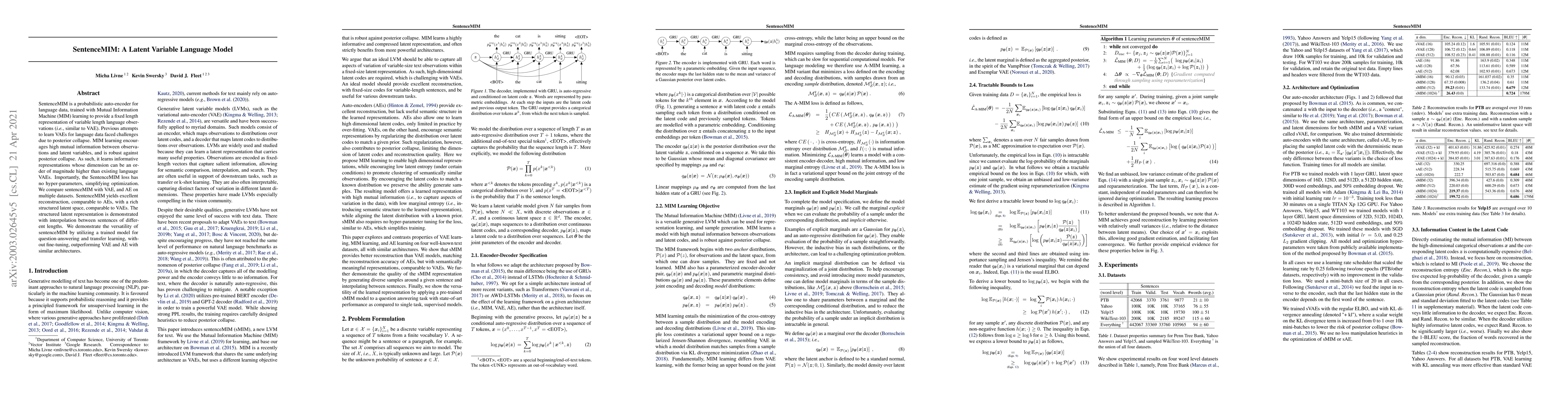 SentenceMIM is a probabilistic auto-encoder for language data, trained with Mutual Information Machine (MIM) learning to provide a fixed length representation of variable length language observations (i.e., similar to VAE). Previous attempts to learn VAEs for language data faced challenges due to posterior collapse. MIM learning encourages high mutual information between observations and latent variables, and is robust against posterior collapse. As such, it learns informative representations whose dimension can be an order of magnitude higher than existing language VAEs. Importantly, the SentenceMIM loss has no hyper-parameters, simplifying optimization. We compare sentenceMIM with VAE, and AE on multiple datasets. SentenceMIM yields excellent reconstruction, comparable to AEs, with a rich structured latent space, comparable to VAEs. The structured latent representation is demonstrated with interpolation between sentences of different lengths. We demonstrate the versatility of sentenceMIM by utilizing a trained model for question-answering and transfer learning, without fine-tuning, outperforming VAE and AE with similar architectures.