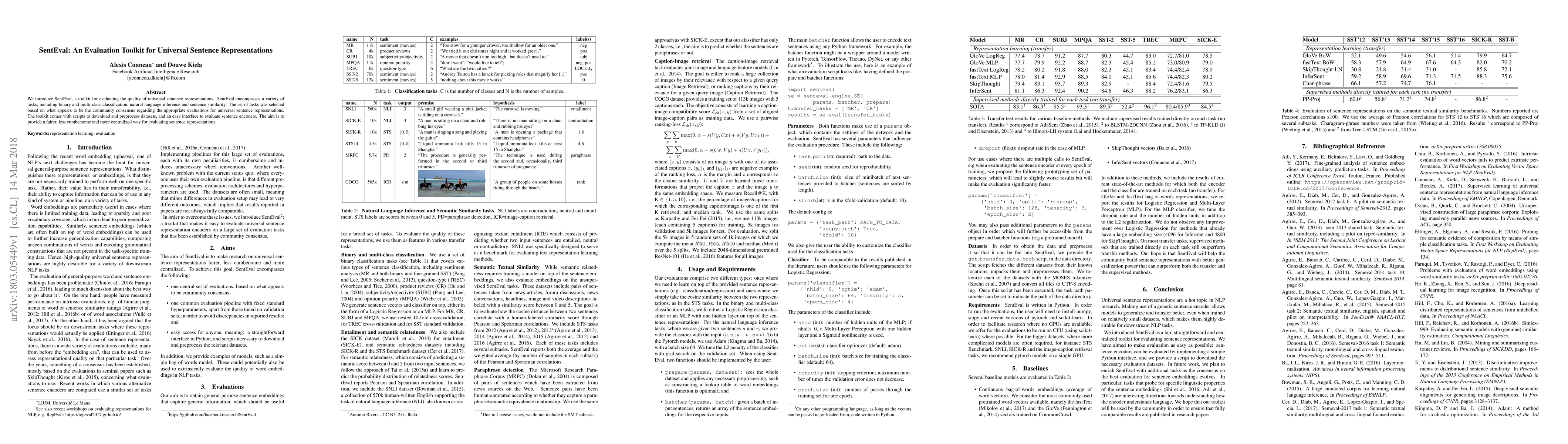 SentEval is a toolkit for assessing universal sentence representations through various tasks like classification and natural language inference, aiming to offer a centralized, streamlined evaluation method. It includes dataset download and preprocessing scripts for easy evaluation of sentence encoders.