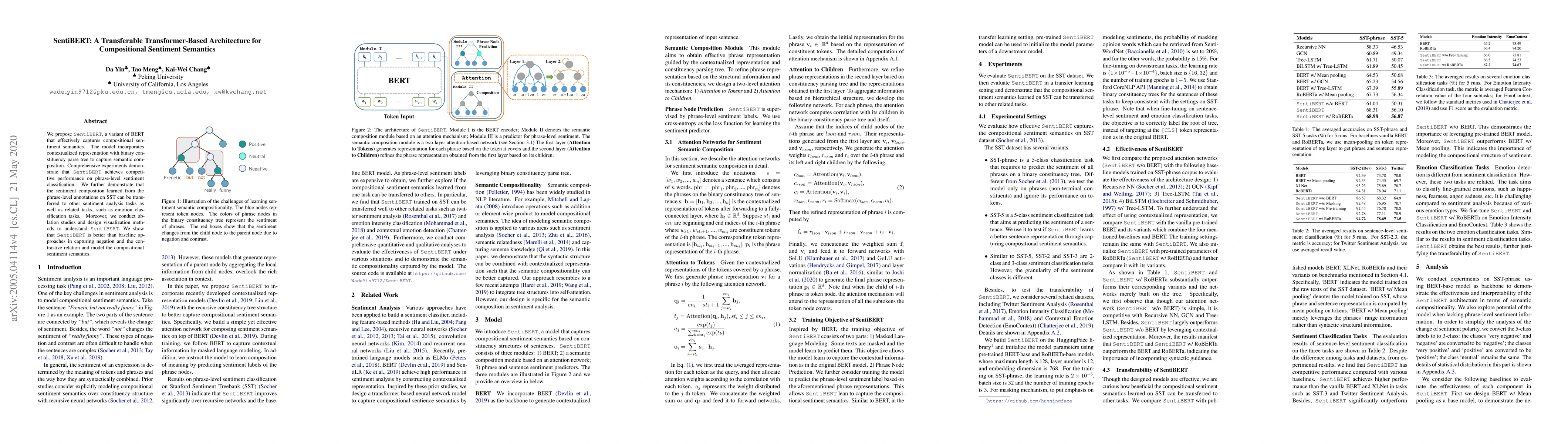 We propose SentiBERT, a variant of BERT that effectively captures compositional sentiment semantics. The model incorporates contextualized representation with binary constituency parse tree to capture semantic composition. Comprehensive experiments demonstrate that SentiBERT achieves competitive performance on phrase-level sentiment classification. We further demonstrate that the sentiment composition learned from the phrase-level annotations on SST can be transferred to other sentiment analysis tasks as well as related tasks, such as emotion classification tasks. Moreover, we conduct ablation studies and design visualization methods to understand SentiBERT. We show that SentiBERT is better than baseline approaches in capturing negation and the contrastive relation and model the compositional sentiment semantics.