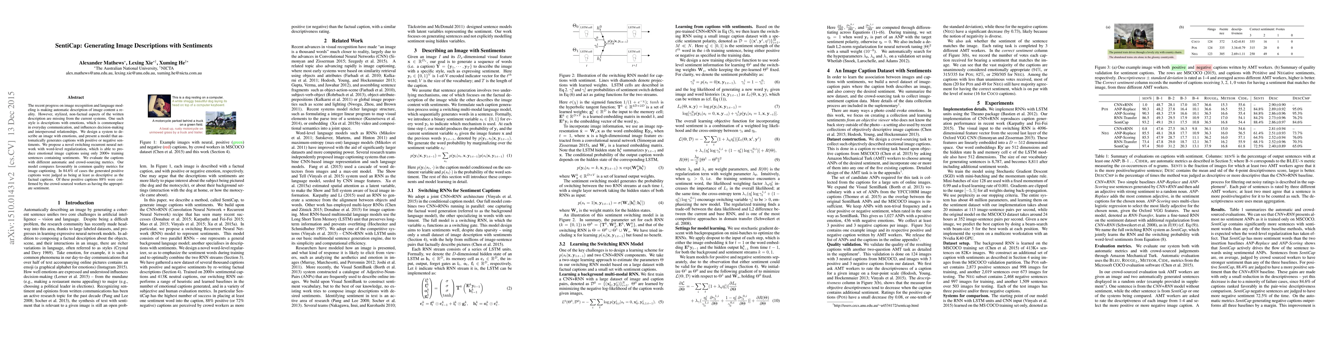 The paper introduces SentiCap, a system that generates image descriptions with emotions, using a switching recurrent neural network with word-level regularization. The model produces captions with positive or negative sentiments, achieving favorable results in both automatic and crowd-sourced evaluations.