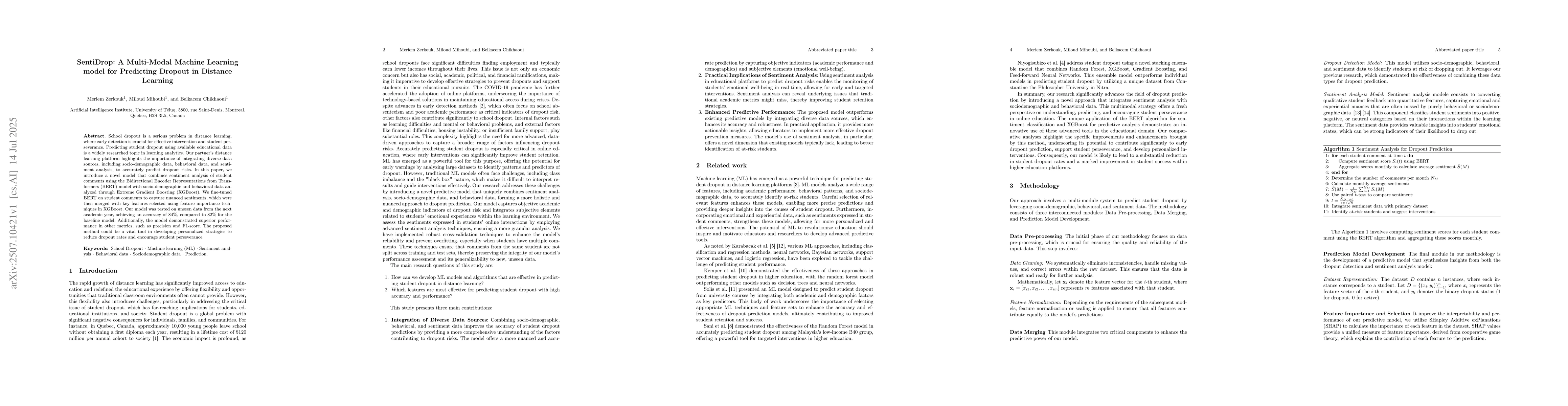 School dropout is a serious problem in distance learning, where early detection is crucial for effective intervention and student perseverance. Predicting student dropout using available educational data is a widely researched topic in learning analytics. Our partner's distance learning platform highlights the importance of integrating diverse data sources, including socio-demographic data, behavioral data, and sentiment analysis, to accurately predict dropout risks. In this paper, we introduce a novel model that combines sentiment analysis of student comments using the Bidirectional Encoder Representations from Transformers (BERT) model with socio-demographic and behavioral data analyzed through Extreme Gradient Boosting (XGBoost). We fine-tuned BERT on student comments to capture nuanced sentiments, which were then merged with key features selected using feature importance techniques in XGBoost. Our model was tested on unseen data from the next academic year, achieving an accuracy of 84\%, compared to 82\% for the baseline model. Additionally, the model demonstrated superior performance in other metrics, such as precision and F1-score. The proposed method could be a vital tool in developing personalized strategies to reduce dropout rates and encourage student perseverance