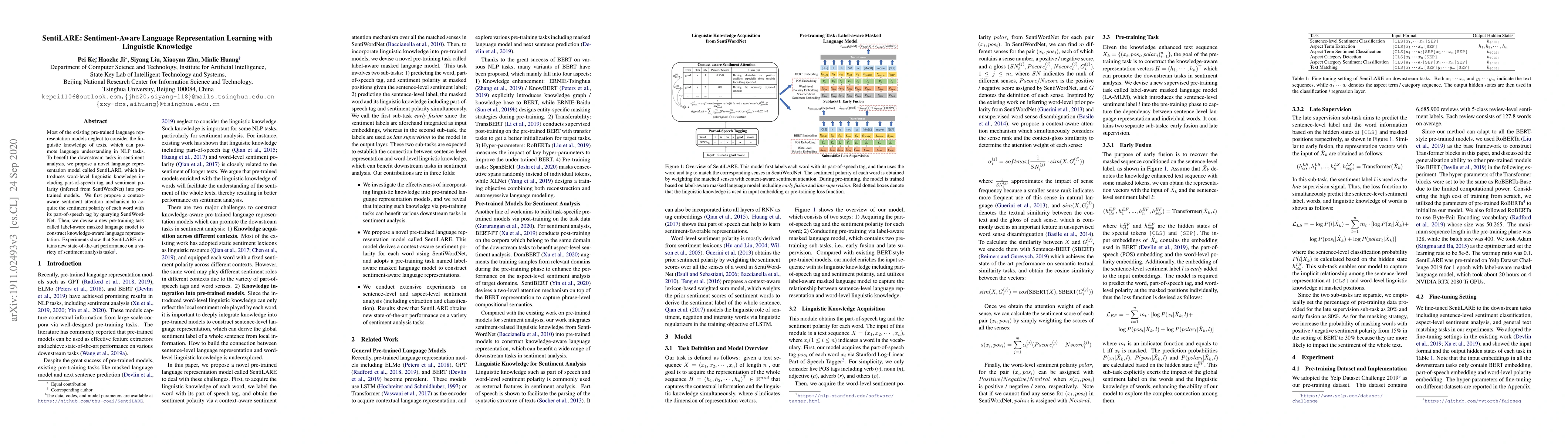 SentiLARE integrates linguistic knowledge, including part-of-speech tags and sentiment polarity, into pre-trained language models to enhance sentiment analysis. It employs a context-aware sentiment attention mechanism and a label-aware masked language model, achieving state-of-the-art results in various sentiment analysis tasks.