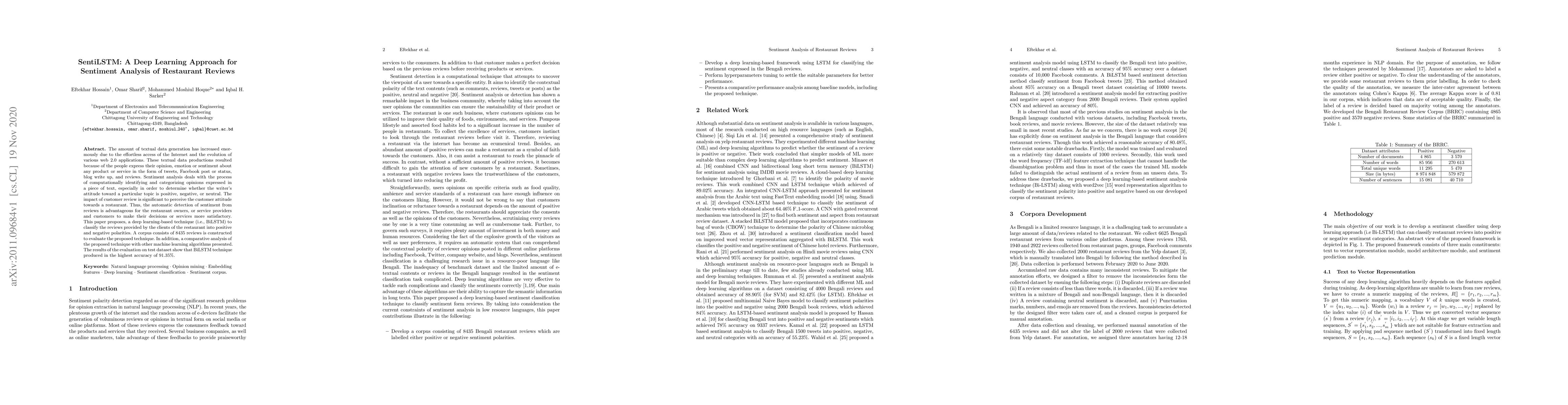 This paper proposes a BiLSTM deep learning approach named SentiLSTM for sentiment analysis of restaurant reviews, achieving an accuracy of 91.35%. The study compares its performance with other machine learning algorithms, demonstrating its effectiveness in classifying customer reviews into positive and negative sentiments.