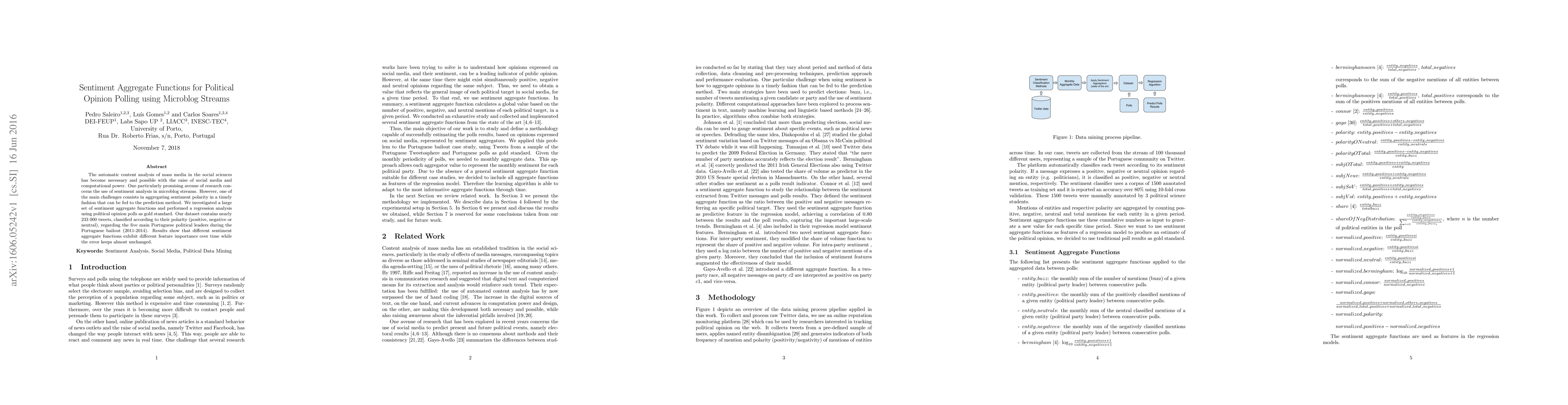 The automatic content analysis of mass media in the social sciences has become necessary and possible with the raise of social media and computational power. One particularly promising avenue of research concerns the use of sentiment analysis in microblog streams. However, one of the main challenges consists in aggregating sentiment polarity in a timely fashion that can be fed to the prediction method. We investigated a large set of sentiment aggregate functions and performed a regression analysis using political opinion polls as gold standard. Our dataset contains nearly 233 000 tweets, classified according to their polarity (positive, negative or neutral), regarding the five main Portuguese political leaders during the Portuguese bailout (2011-2014). Results show that different sentiment aggregate functions exhibit different feature importance over time while the error keeps almost unchanged.