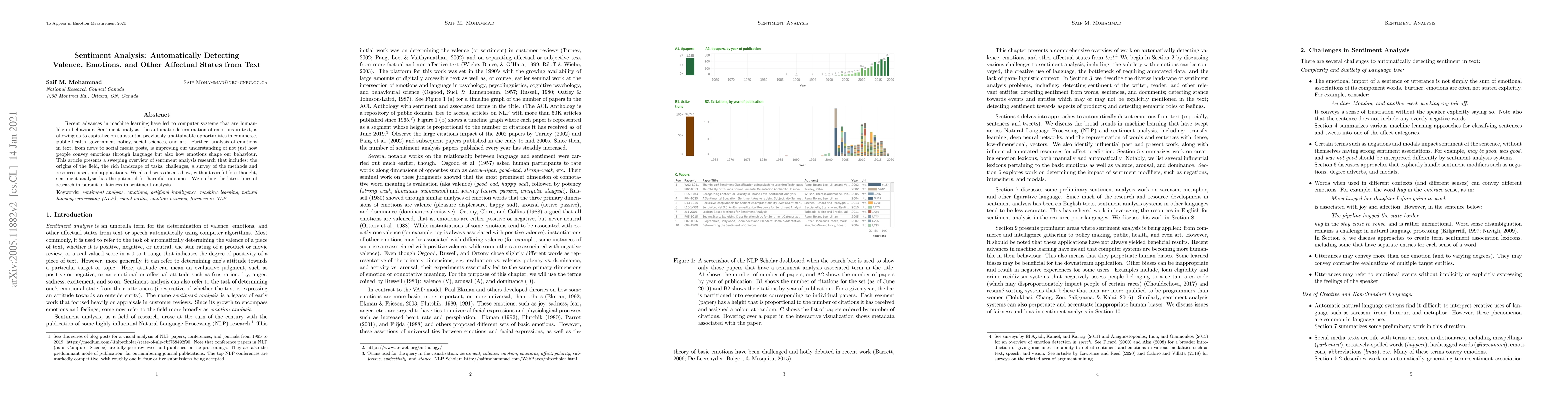 Recent advances in machine learning have led to computer systems that are human-like in behaviour. Sentiment analysis, the automatic determination of emotions in text, is allowing us to capitalize on substantial previously unattainable opportunities in commerce, public health, government policy, social sciences, and art. Further, analysis of emotions in text, from news to social media posts, is improving our understanding of not just how people convey emotions through language but also how emotions shape our behaviour. This article presents a sweeping overview of sentiment analysis research that includes: the origins of the field, the rich landscape of tasks, challenges, a survey of the methods and resources used, and applications. We also discuss discuss how, without careful fore-thought, sentiment analysis has the potential for harmful outcomes. We outline the latest lines of research in pursuit of fairness in sentiment analysis.