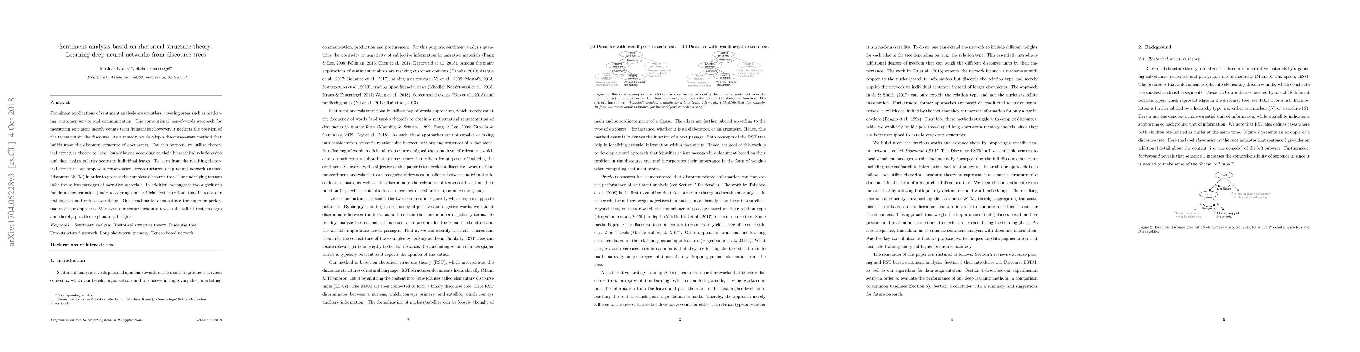 This paper proposes a novel sentiment analysis method based on rhetorical structure theory, employing a tensor-based deep neural network (Discourse-LSTM) to process discourse trees. The method enhances sentiment analysis by considering the hierarchical relationships within text, and includes data augmentation techniques to improve performance and reduce overfitting.