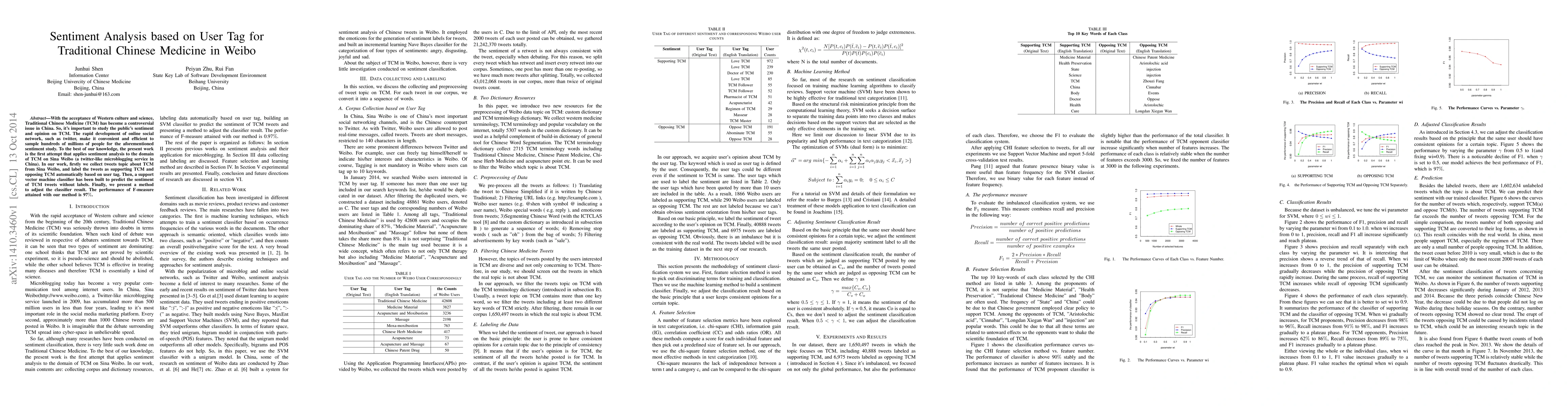 This paper presents a novel sentiment analysis method for Traditional Chinese Medicine (TCM) on Sina Weibo, employing user tags to label tweets as supporting or opposing TCM. A support vector machine classifier achieves a high F-measure of 97% in predicting unlabeled TCM sentiment tweets.