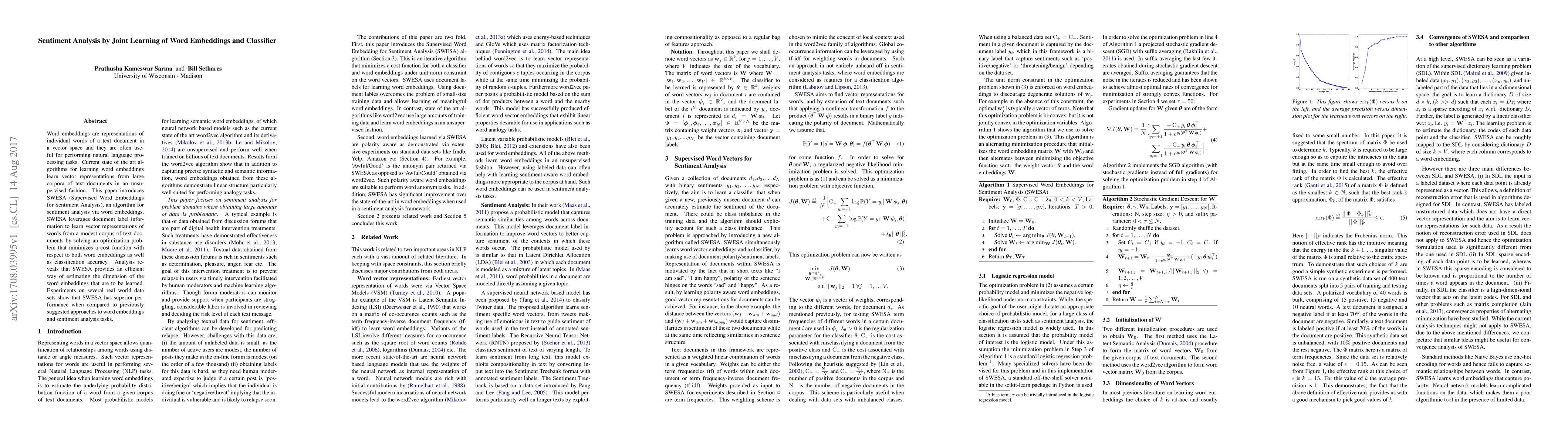 This paper proposes SWESA, a method for sentiment analysis that combines supervised learning of word embeddings with a classifier to achieve better performance. Experiments show that SWESA outperforms existing techniques on various datasets.