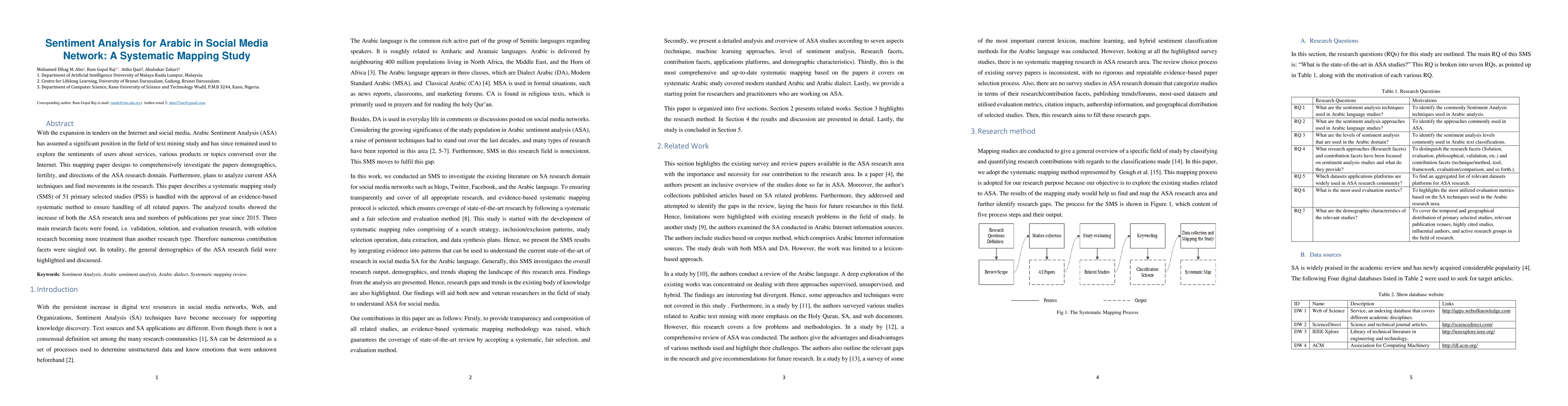 This paper conducts a systematic mapping study of Arabic Sentiment Analysis (ASA) in social media, identifying trends and key research areas from 51 selected studies. The findings highlight an increasing publication rate since 2015, with solution research being the most prevalent, followed by validation and evaluation research.