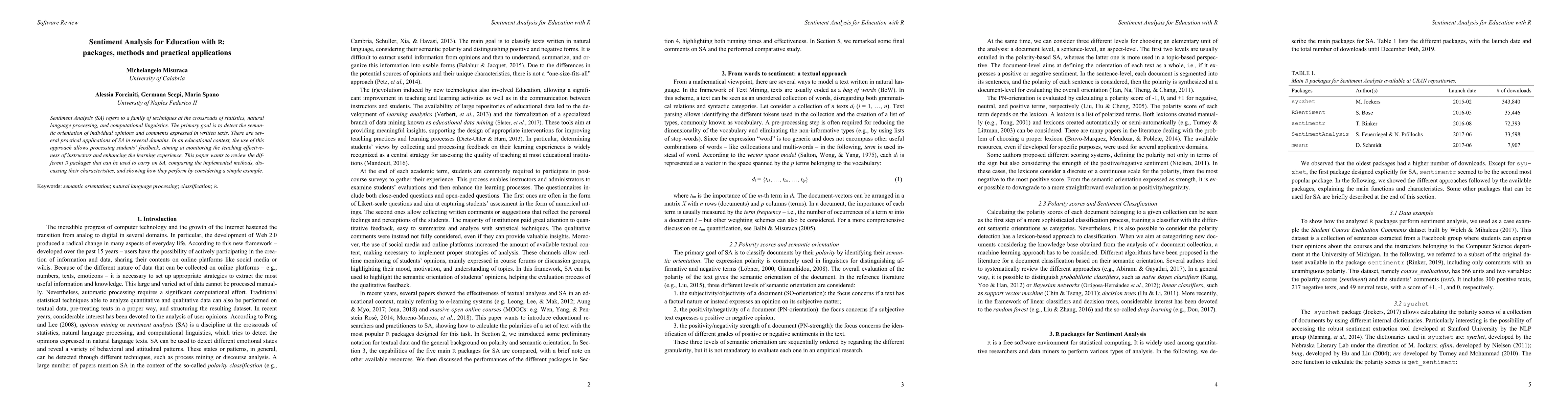 Sentiment Analysis (SA) refers to a family of techniques at the crossroads of statistics, natural language processing, and computational linguistics. The primary goal is to detect the semantic orientation of individual opinions and comments expressed in written texts. There are several practical applications of SA in several domains. In an educational context, the use of this approach allows processing students' feedback, aiming at monitoring the teaching effectiveness of instructors and enhancing the learning experience. This paper wants to review the different R packages that can be used to carry on SA, comparing the implemented methods, discussing their characteristics, and showing how they perform by considering a simple example.
