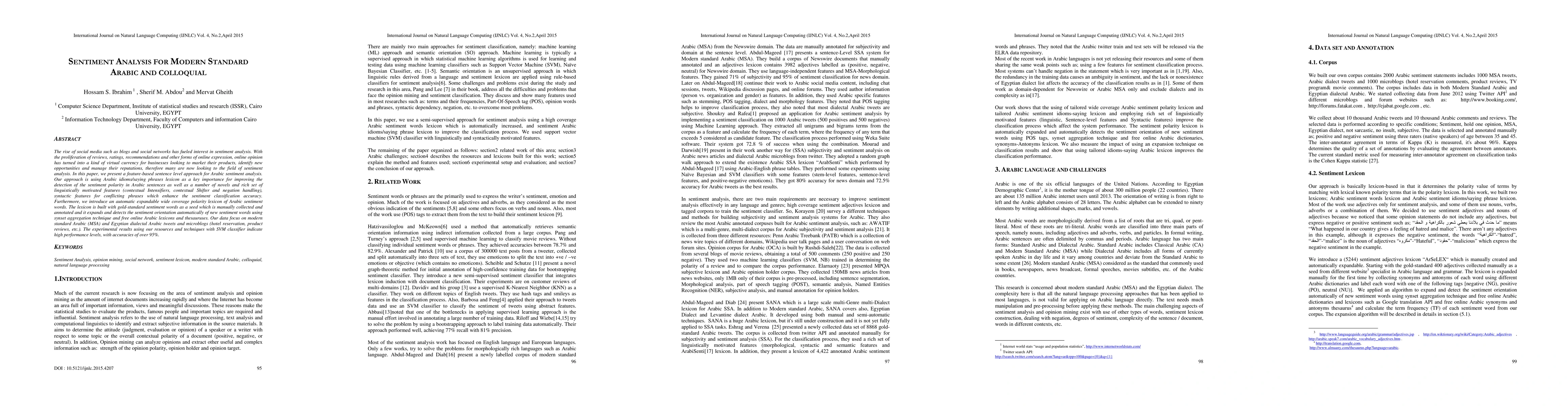 This paper presents a feature-based sentence-level approach for Arabic sentiment analysis, utilizing an idiomatic lexicon and contextual features to enhance detection accuracy. It introduces an expandable polarity lexicon for sentiment words and reports over 95% accuracy using SVM classifiers on MSA and Egyptian dialectal texts.