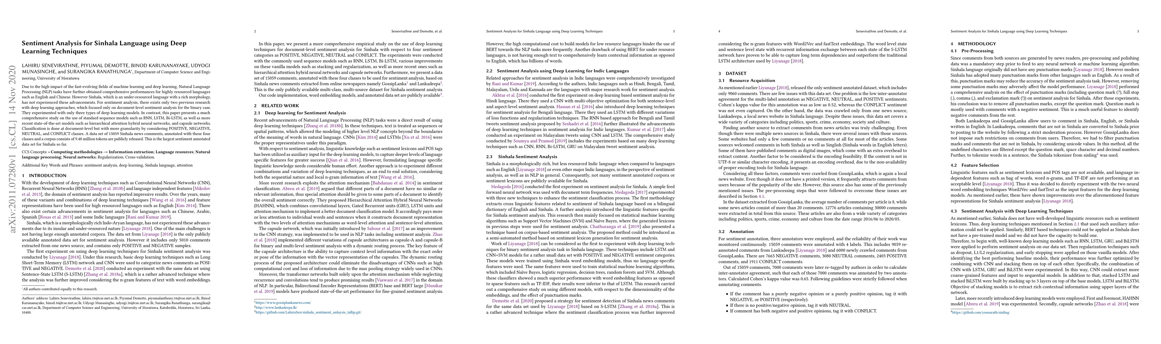This paper explores sentiment analysis for Sinhala using various deep learning techniques, including RNN, LSTM, Bi-LSTM, and advanced models like hierarchical attention hybrid neural networks and capsule networks. It introduces a comprehensive dataset of 15,059 annotated Sinhala news comments, marking the largest sentiment-annotated dataset for Sinhala.