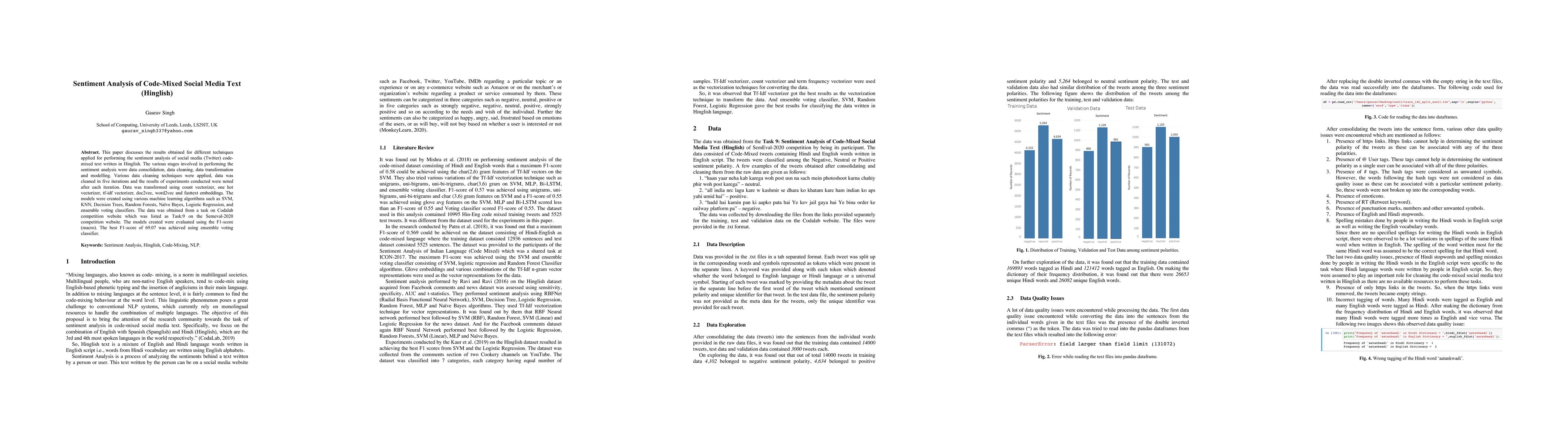 This paper discusses the results obtained for different techniques applied for performing the sentiment analysis of social media (Twitter) code-mixed text written in Hinglish. The various stages involved in performing the sentiment analysis were data consolidation, data cleaning, data transformation and modelling. Various data cleaning techniques were applied, data was cleaned in five iterations and the results of experiments conducted were noted after each iteration. Data was transformed using count vectorizer, one hot vectorizer, tf-idf vectorizer, doc2vec, word2vec and fasttext embeddings. The models were created using various machine learning algorithms such as SVM, KNN, Decision Trees, Random Forests, Naive Bayes, Logistic Regression, and ensemble voting classifiers. The data was obtained from a task on Codalab competition website which was listed as Task:9 on the Semeval-2020 competition website. The models created were evaluated using the F1-score (macro). The best F1-score of 69.07 was achieved using ensemble voting classifier.