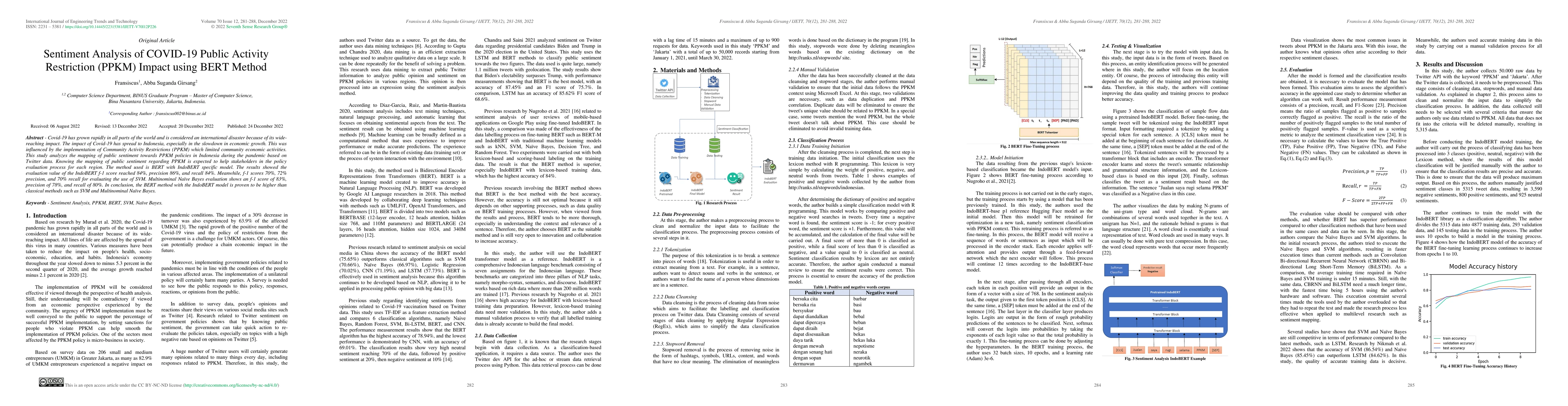 This study analyzes public sentiment towards Indonesia's COVID-19 activity restrictions (PPKM) using BERT with the IndoBERT model on Twitter data. The BERT method outperformed classical methods like SVM and Multinomial Naive Bayes, achieving an f-1 score of 84%, precision 86%, and recall 84%.