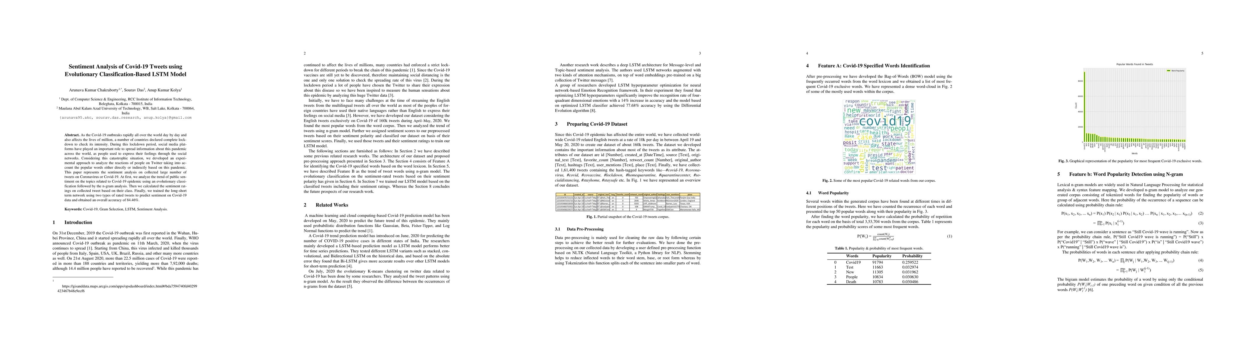 This paper presents a sentiment analysis of Covid-19 related tweets using an evolutionary classification-based LSTM model, achieving an accuracy of 84.46%. The study analyzes public sentiment trends and employs n-gram analysis to understand reactions during the pandemic.