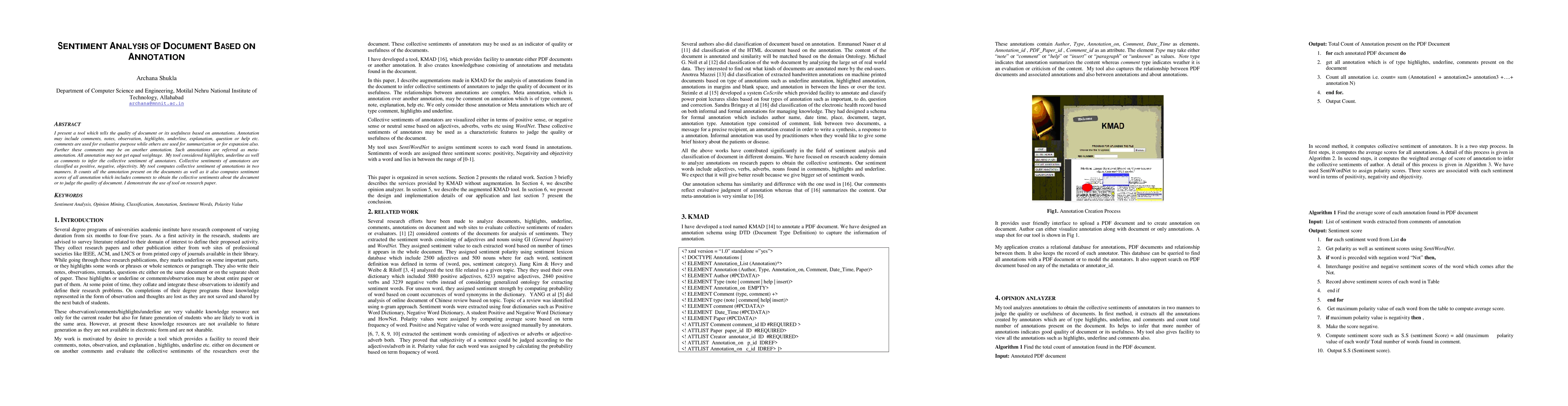 I present a tool which tells the quality of document or its usefulness based on annotations. Annotation may include comments, notes, observation, highlights, underline, explanation, question or help etc. comments are used for evaluative purpose while others are used for summarization or for expansion also. Further these comments may be on another annotation. Such annotations are referred as meta-annotation. All annotation may not get equal weightage. My tool considered highlights, underline as well as comments to infer the collective sentiment of annotators. Collective sentiments of annotators are classified as positive, negative, objectivity. My tool computes collective sentiment of annotations in two manners. It counts all the annotation present on the documents as well as it also computes sentiment scores of all annotation which includes comments to obtain the collective sentiments about the document or to judge the quality of document. I demonstrate the use of tool on research paper.