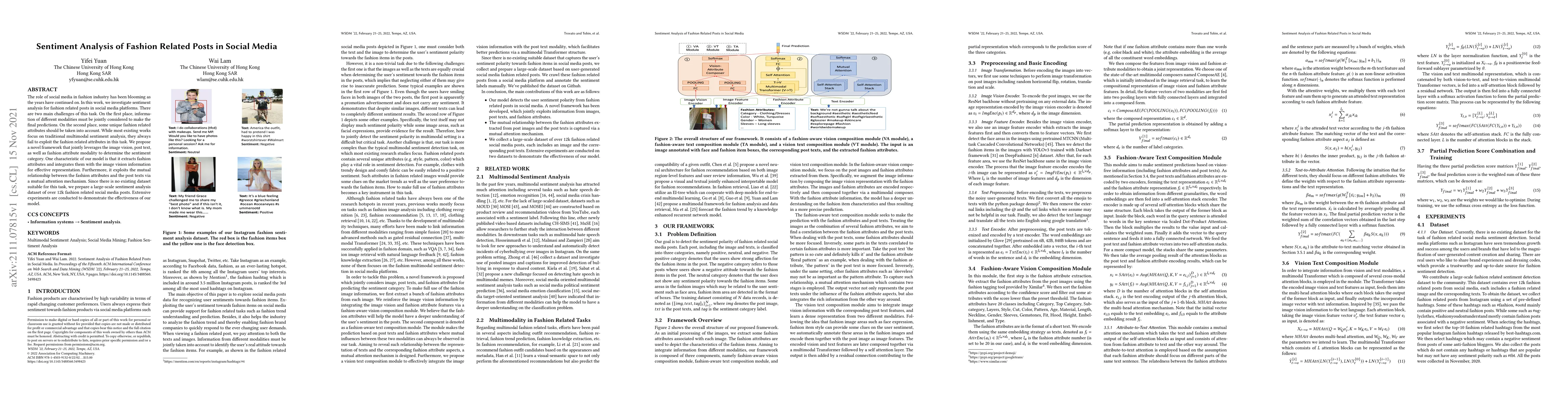 This paper proposes a novel framework for sentiment analysis of fashion-related social media posts, integrating image vision, text, and fashion attributes. The model extracts and combines fashion-specific attributes with visual information and text to enhance sentiment prediction, addressing the unique challenges of fashion-related content.