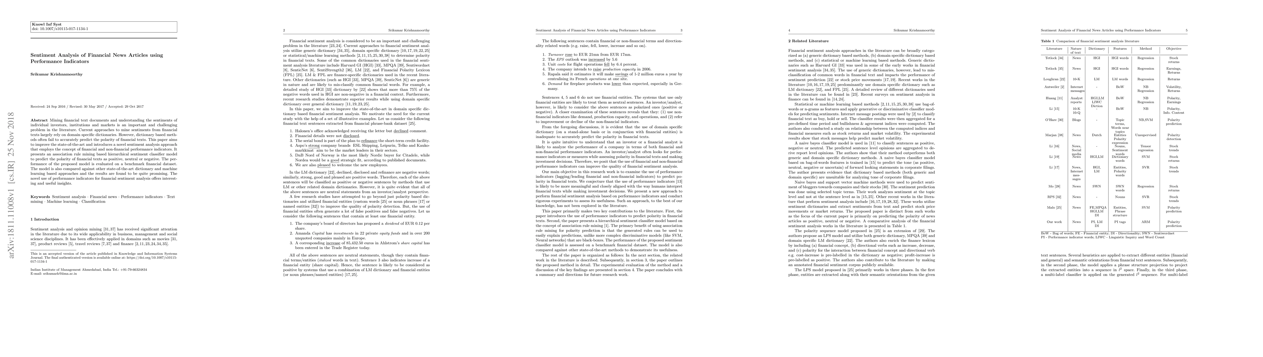 This paper introduces a novel sentiment analysis model for financial news articles using performance indicators, aiming to improve accuracy over dictionary-based methods. The proposed hierarchical sentiment classifier, evaluated on a benchmark dataset, shows promising results compared to existing approaches.