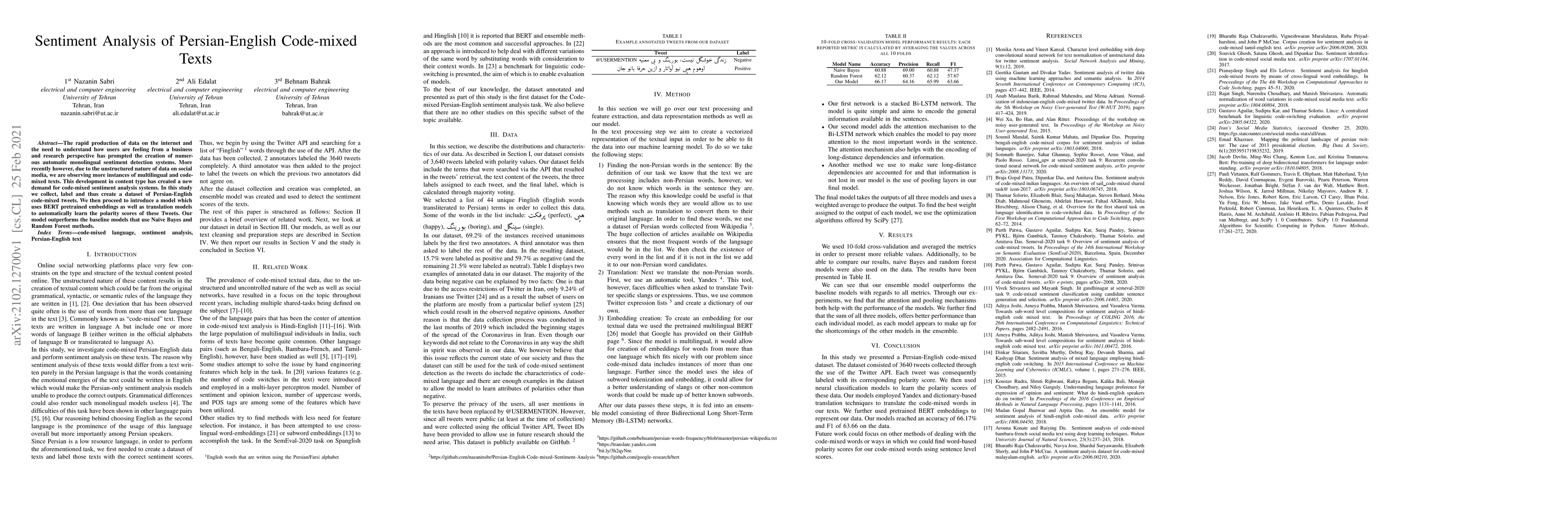 This study develops a dataset of Persian-English code-mixed tweets and introduces a model leveraging BERT embeddings and translation techniques to analyze sentiment. The proposed model outperforms traditional baselines using Na\"ive Bayes and Random Forest.