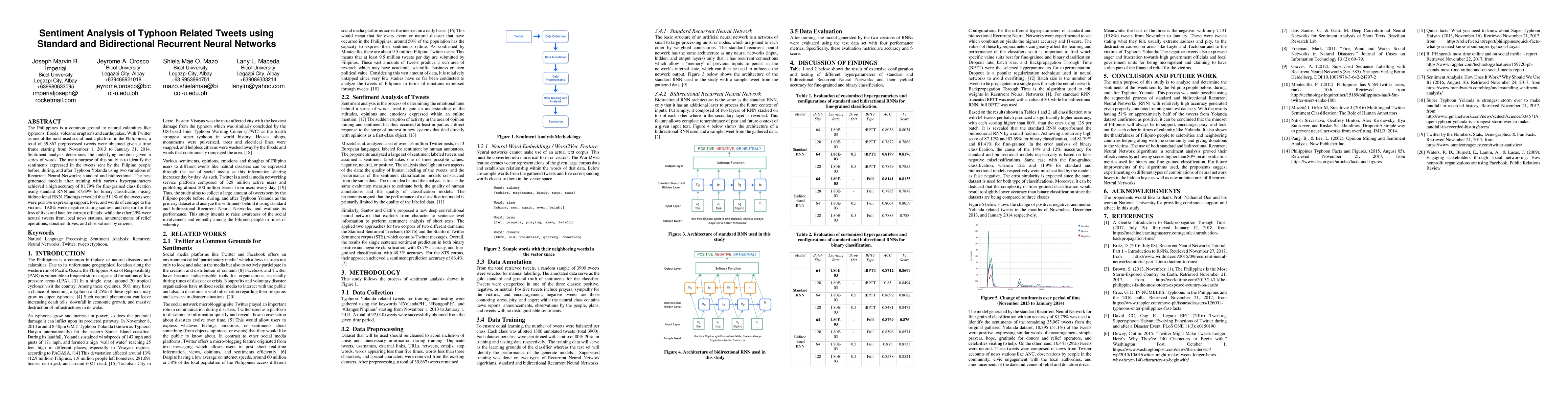 This study analyzed 39,867 tweets about Typhoon Yolanda using Recurrent Neural Networks, finding that 51% were positive, 19% negative, and 29% neutral, with models achieving high accuracy rates of up to 87.69%.
