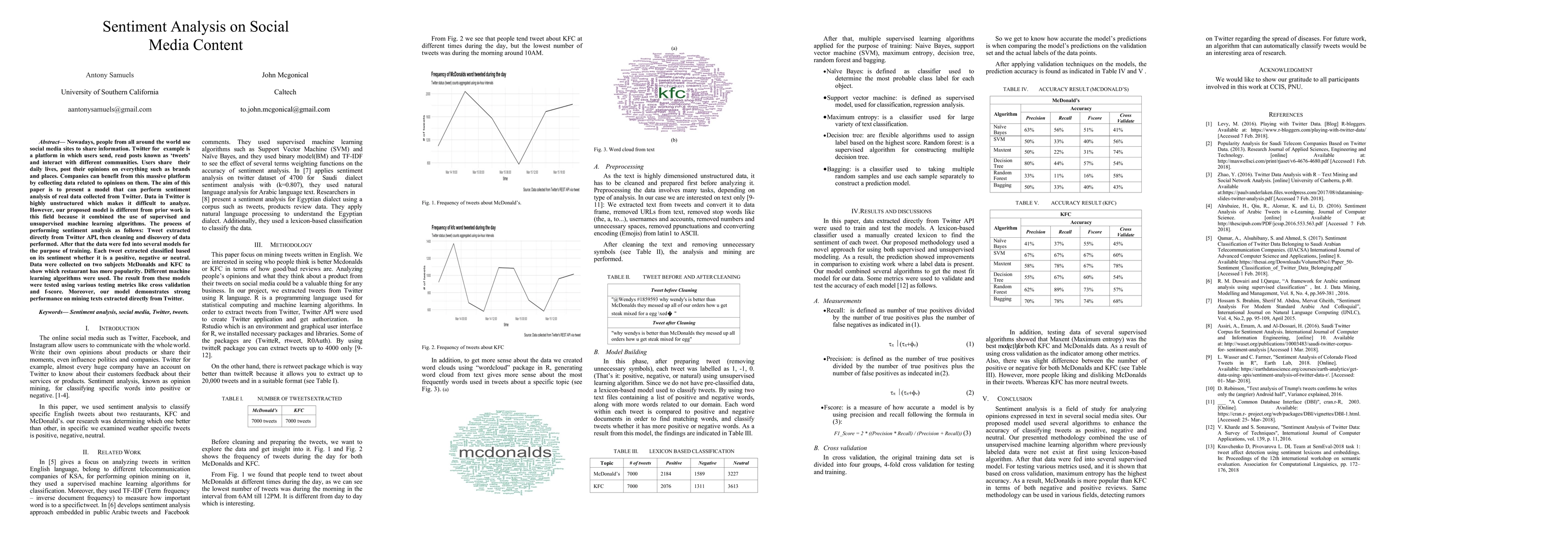 This paper proposes a hybrid model combining supervised and unsupervised machine learning algorithms for sentiment analysis on Twitter data. The model effectively classifies tweets from Twitter API as positive, negative, or neutral, and demonstrates strong performance in analyzing unstructured social media content, as evidenced by its application to McDonald's and KFC's brand popularity.