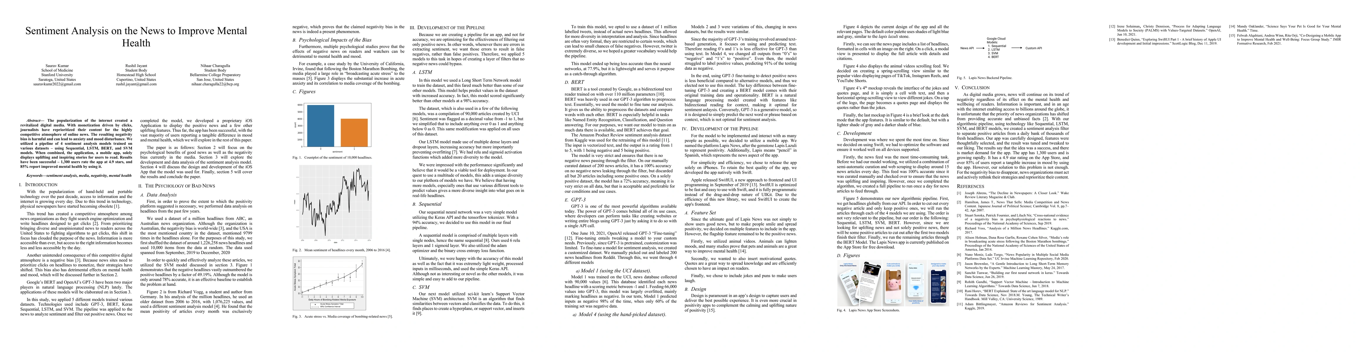 A sentiment analysis pipeline using 4 models combined into a mobile app reduces online news negativity, leading to improved mental health outcomes for 85% of users.