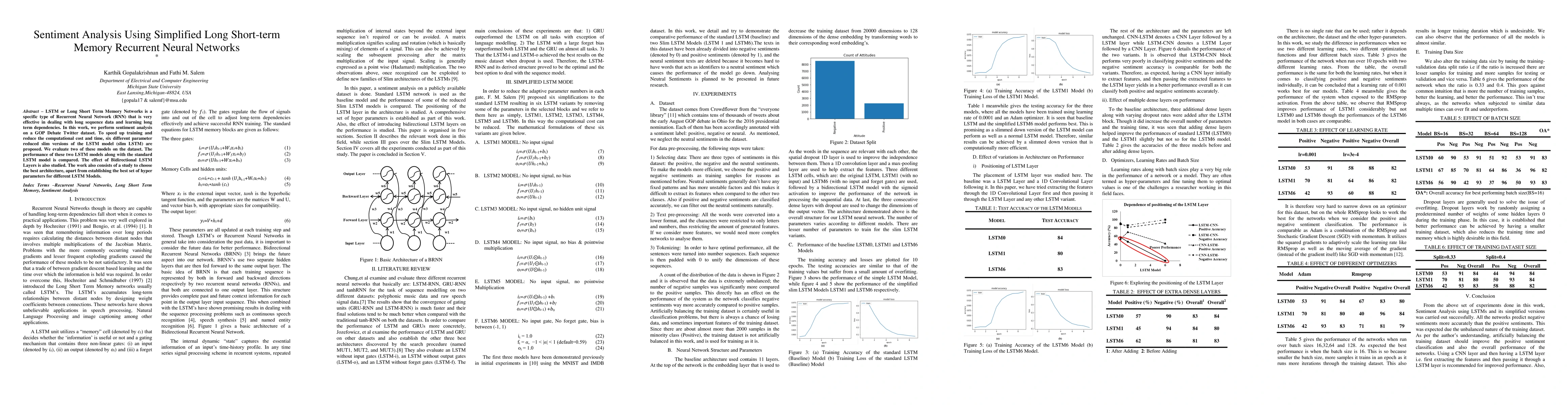 This paper proposes simplified versions of LSTM models to perform sentiment analysis on a GOP Debate Twitter dataset, aiming to reduce training time and computational cost. The study compares the performance of slim LSTM models against the standard LSTM, evaluates bidirectional LSTM layers, and determines the optimal architecture and hyperparameters.
