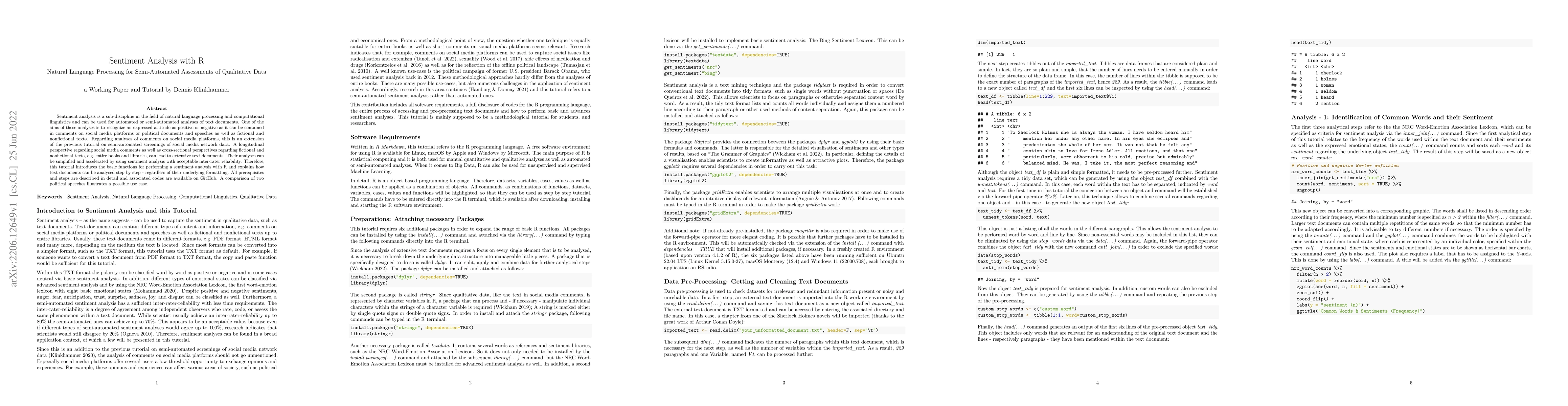 This paper provides a tutorial on using R for sentiment analysis in natural language processing, focusing on semi-automated assessments of qualitative data. It details the basic functions for analyzing text documents, with examples from social media comments and political speeches, and offers associated codes on GitHub for reproducibility.