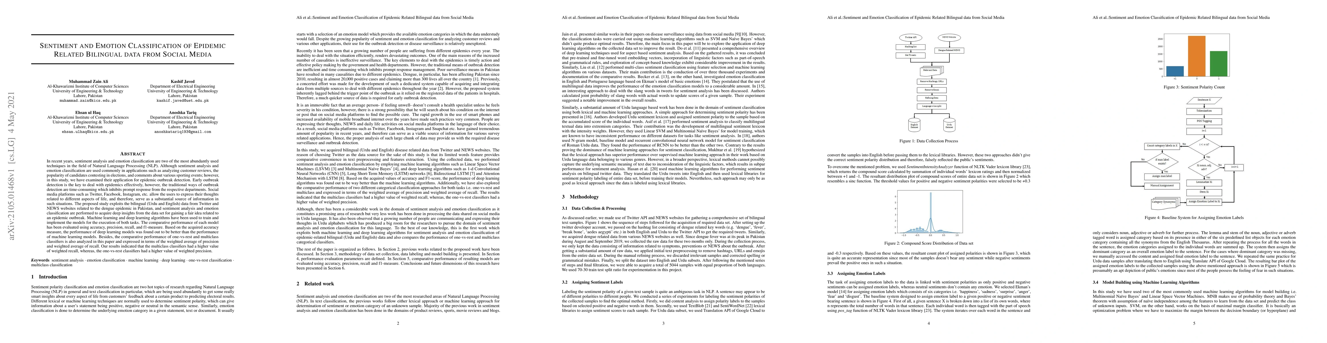This study applies sentiment analysis and emotion classification to bilingual (Urdu and English) social media data to detect dengue epidemic outbreaks early. Machine learning and deep learning models are trained on Twitter and NEWS data to gain insights, with performance evaluated using accuracy, precision, recall, and f1-measure.
