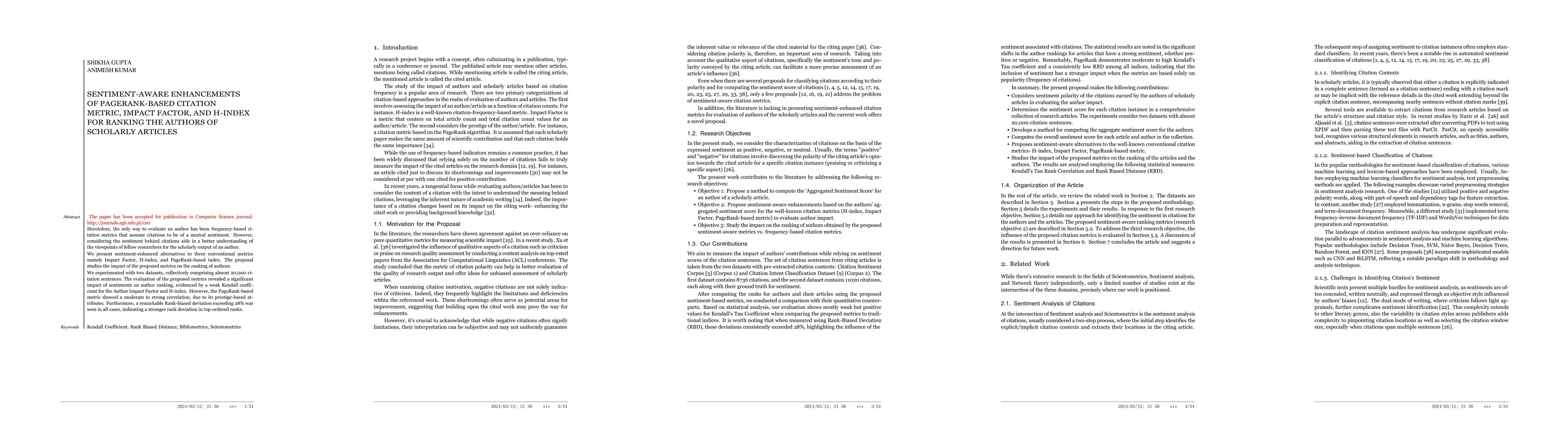 This study proposes enhancements to traditional citation metrics like PageRank, Impact Factor, and H-index by incorporating sentiment analysis to better reflect the true impact of scholarly articles based on the sentiment behind citations. Such sentiment-aware metrics provide a more nuanced understanding of an author’s research contributions.