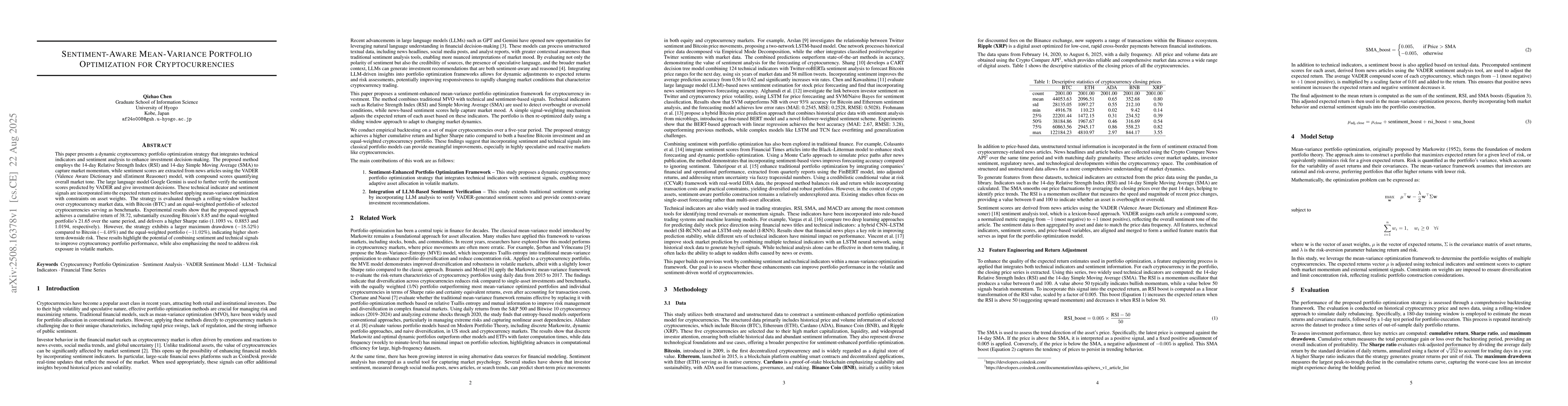 This paper presents a dynamic cryptocurrency portfolio optimization strategy that integrates technical indicators and sentiment analysis to enhance investment decision-making. The proposed method employs the 14-day Relative Strength Index (RSI) and 14-day Simple Moving Average (SMA) to capture market momentum, while sentiment scores are extracted from news articles using the VADER (Valence Aware Dictionary and sEntiment Reasoner) model, with compound scores quantifying overall market tone. The large language model Google Gemini is used to further verify the sentiment scores predicted by VADER and give investment decisions. These technical indicator and sentiment signals are incorporated into the expected return estimates before applying mean-variance optimization with constraints on asset weights. The strategy is evaluated through a rolling-window backtest over cryptocurrency market data, with Bitcoin (BTC) and an equal-weighted portfolio of selected cryptocurrencies serving as benchmarks. Experimental results show that the proposed approach achieves a cumulative return of 38.72, substantially exceeding Bitcoin's 8.85 and the equal-weighted portfolio's 21.65 over the same period, and delivers a higher Sharpe ratio (1.1093 vs. 0.8853 and 1.0194, respectively). However, the strategy exhibits a larger maximum drawdown (-18.52%) compared to Bitcoin (-4.48%) and the equal-weighted portfolio (-11.02%), indicating higher short-term downside risk. These results highlight the potential of combining sentiment and technical signals to improve cryptocurrency portfolio performance, while also emphasizing the need to address risk exposure in volatile markets.