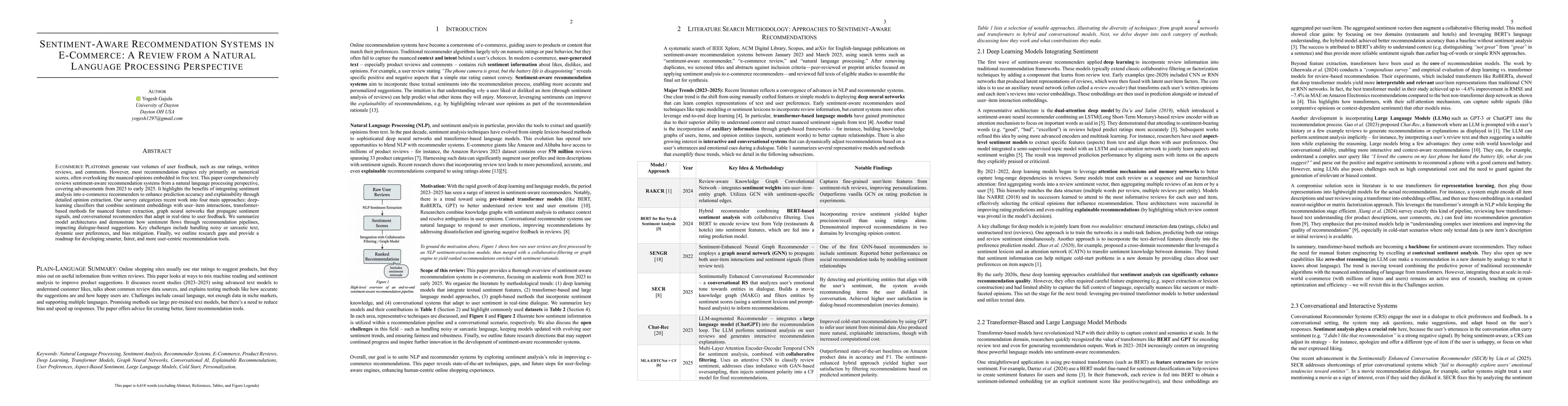 A review of sentiment-aware recommendation systems in e-commerce highlights advancements from 2023 to early 2025, emphasizing the benefits of integrating sentiment analysis for enhanced prediction accuracy and explainability.