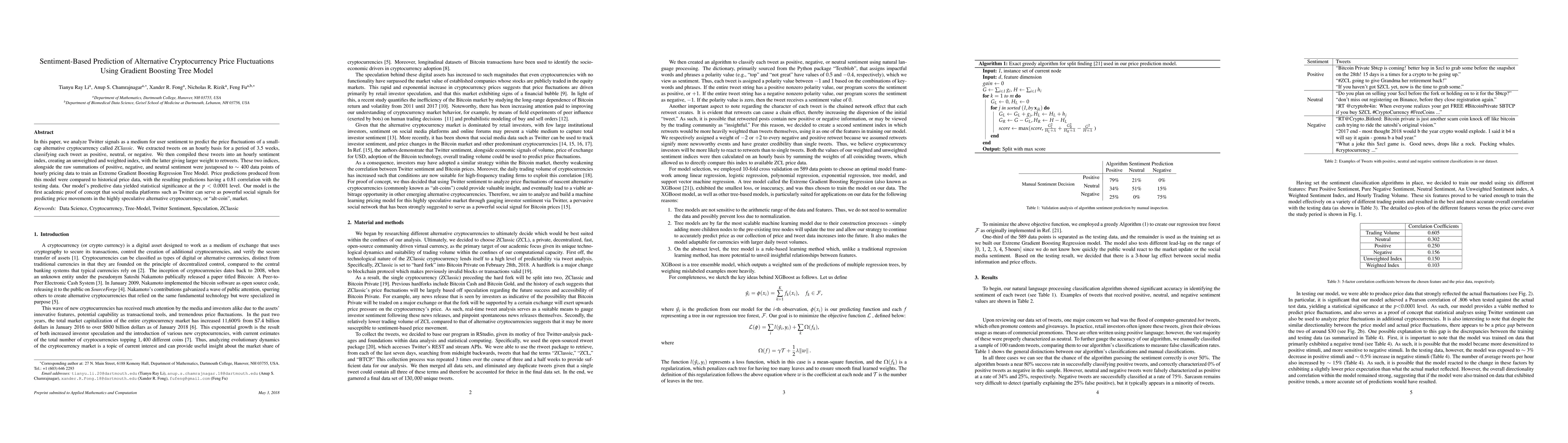 The research utilized Twitter signals for sentiment analysis to predict price fluctuations of ZClassic, a small-cap alternative cryptocurrency. Tweets were classified as positive, neutral, or negative using natural language processing, with sentiment scores assigned based on a dictionary primarily sourced from the Textblob Python package. Two sentiment indices were created: an unweighted and a weighted one, with the latter giving more weight to retweets. These indices, along with raw sentiment sums, were used to train an Extreme Gradient Boosting Regression Tree Model.