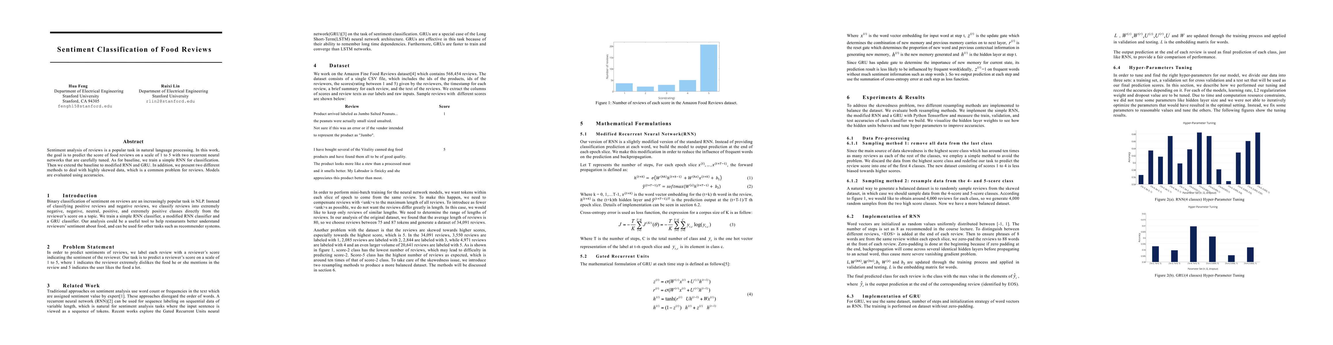 This paper proposes two recurrent neural networks—RNN and GRU—to classify food reviews on a 1 to 5 scale, addressing skewed data issues with two methods. Model performance is evaluated based on accuracy.