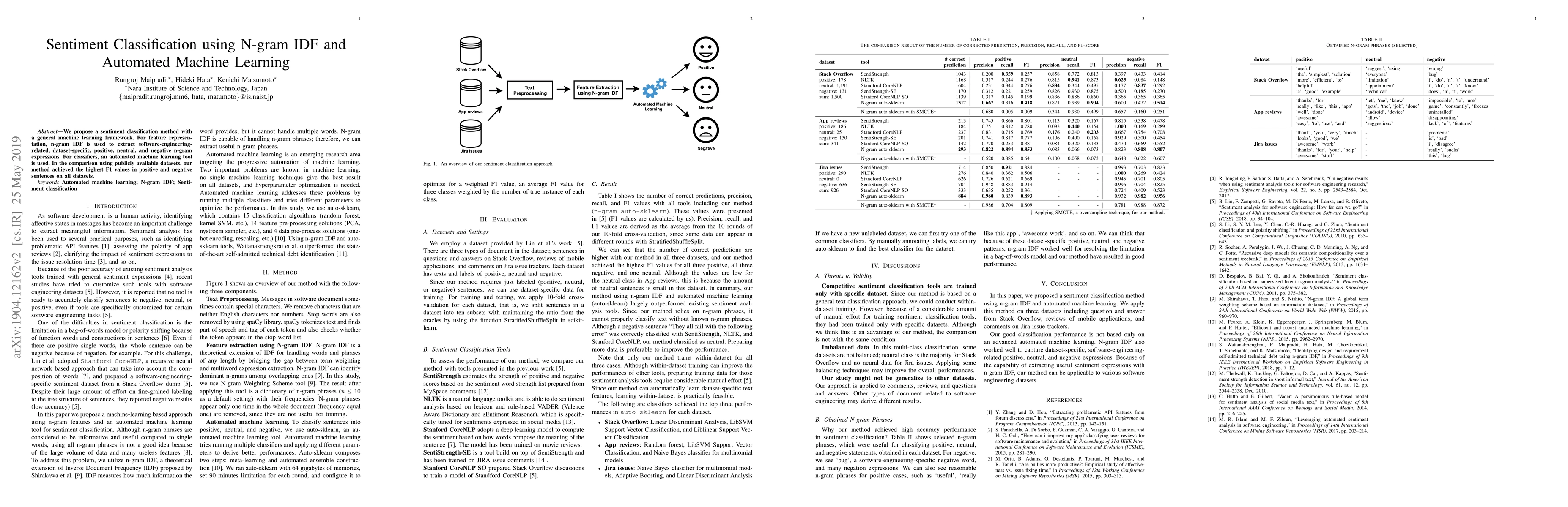 This paper proposes a sentiment classification method using n-gram IDF for feature extraction and automated machine learning tools for classifiers, achieving the highest F1 scores in positive and negative sentiment detection across multiple datasets.