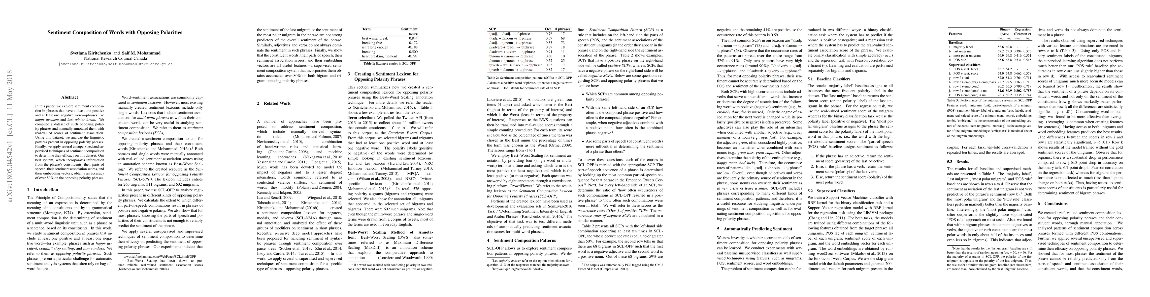 This paper investigates sentiment composition in phrases with opposing polarity words, analyzing linguistic patterns and testing various sentiment composition techniques. The best model, using constituents' information and embedding vectors, achieves over 80% accuracy in sentiment association.