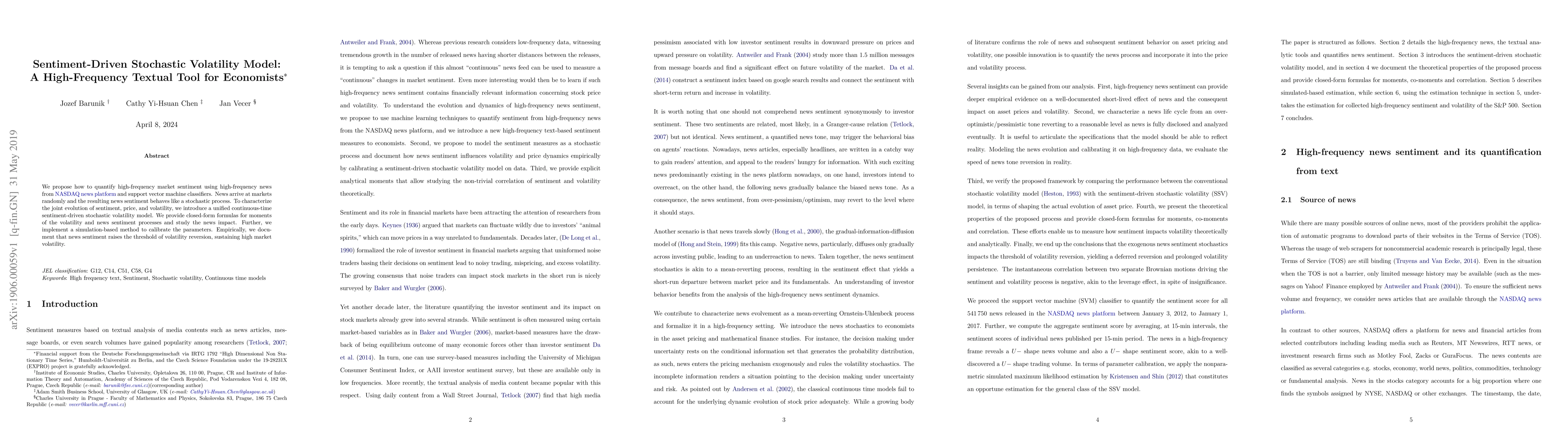 This paper proposes a sentiment-driven stochastic volatility model to quantify high-frequency market sentiment using NASDAQ news and SVM classifiers. It introduces a continuous-time model to characterize the joint evolution of sentiment, price, and volatility, showing that news sentiment raises the volatility threshold and sustains high market volatility.