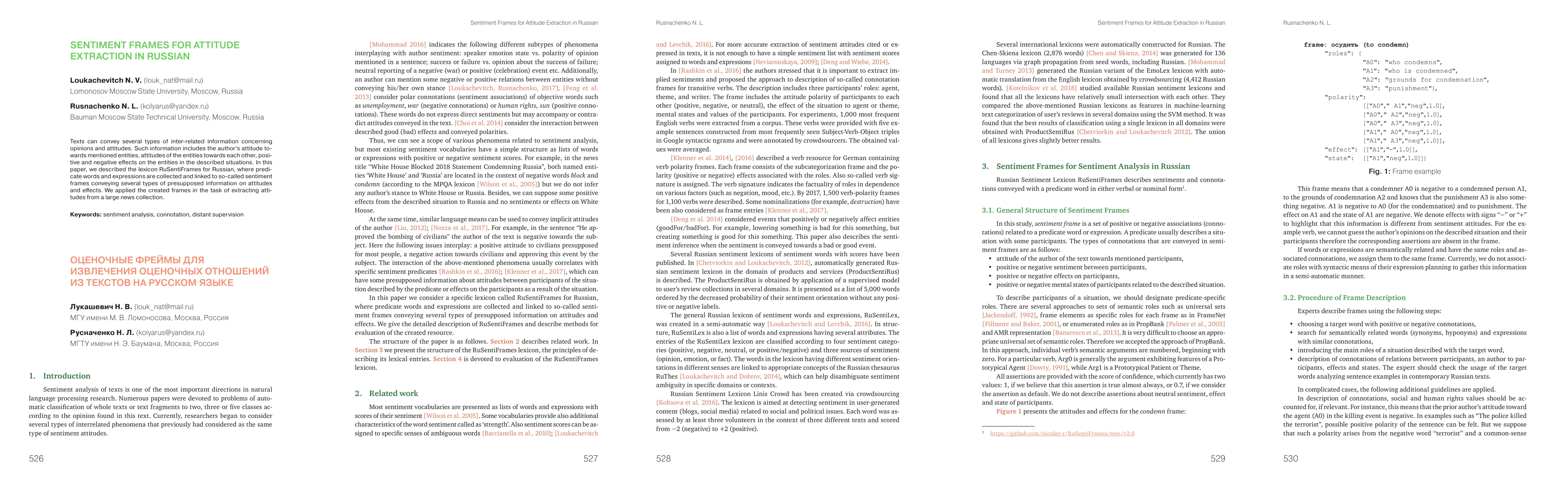 Texts can convey several types of inter-related information concerning opinions and attitudes. Such information includes the author's attitude towards mentioned entities, attitudes of the entities towards each other, positive and negative effects on the entities in the described situations. In this paper, we described the lexicon RuSentiFrames for Russian, where predicate words and expressions are collected and linked to so-called sentiment frames conveying several types of presupposed information on attitudes and effects. We applied the created frames in the task of extracting attitudes from a large news collection.