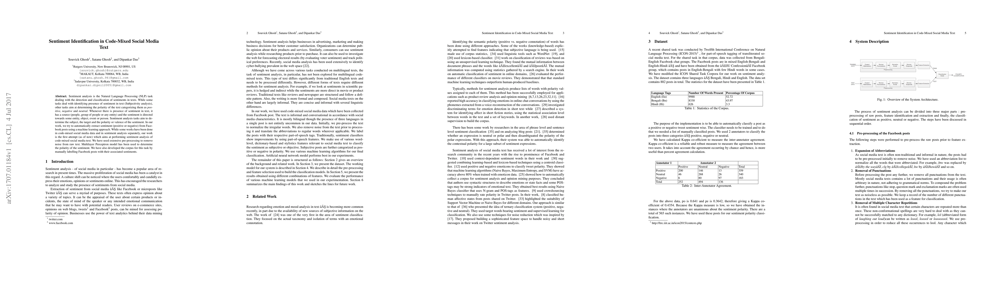 This paper presents a machine learning approach for sentiment analysis in code-mixed social media text, specifically Facebook posts. It employs a Multilayer Perceptron model after extensive pre-processing and has developed a manually labeled corpus for training.