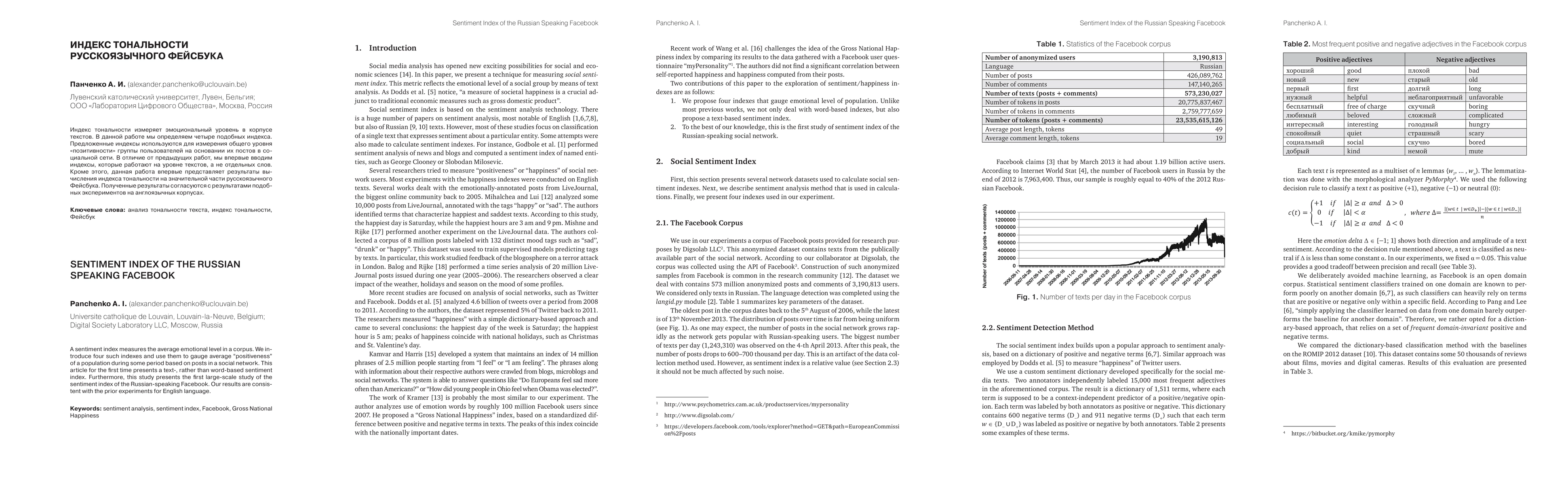 A sentiment index measures the average emotional level in a corpus. We introduce four such indexes and use them to gauge average "positiveness" of a population during some period based on posts in a social network. This article for the first time presents a text-, rather than word-based sentiment index. Furthermore, this study presents the first large-scale study of the sentiment index of the Russian-speaking Facebook. Our results are consistent with the prior experiments for the English language.