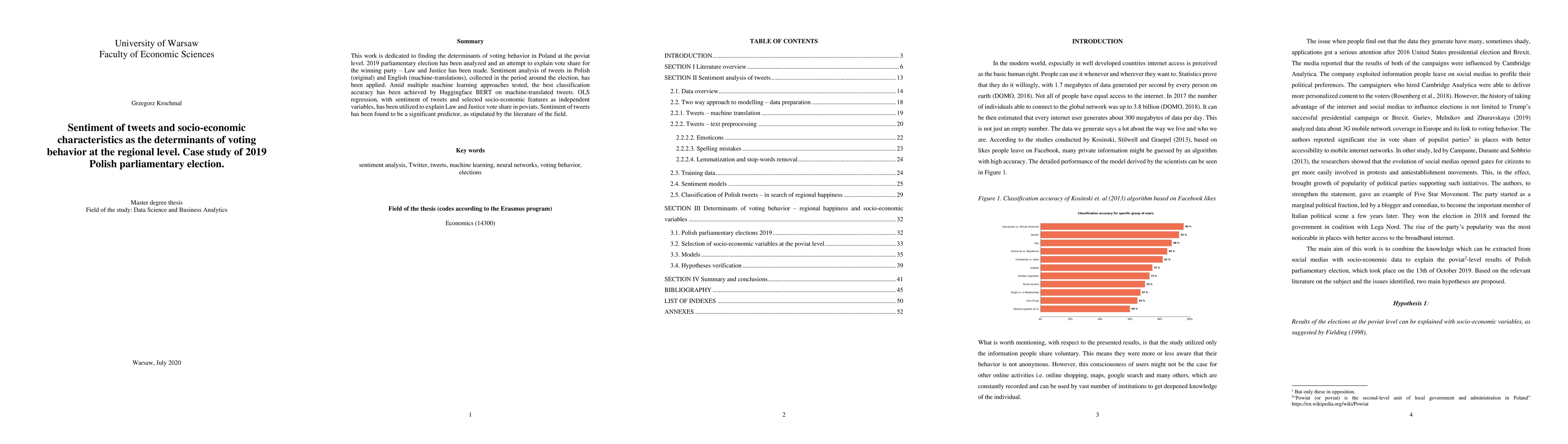 This work is dedicated to finding the determinants of voting behavior in Poland at the poviat level. 2019 parliamentary election has been analyzed and an attempt to explain vote share for the winning party (Law and Justice) has been made. Sentiment analysis of tweets in Polish (original) and English (machine-translations), collected in the period around the election, has been applied. Amid multiple machine learning approaches tested, the best classification accuracy has been achieved by Huggingface BERT on machine-translated tweets. OLS regression, with sentiment of tweets and selected socio-economic features as independent variables, has been utilized to explain Law and Justice vote share in poviats. Sentiment of tweets has been found to be a significant predictor, as stipulated by the literature of the field.