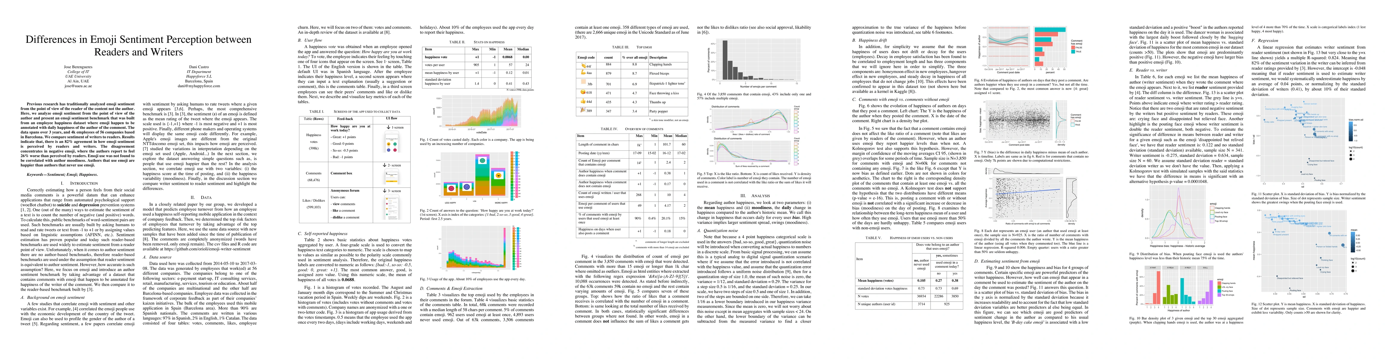 Previous research has traditionally analyzed emoji sentiment from the point of view of the reader of the content not the author. Here, we analyze emoji sentiment from the point of view of the author and present a emoji sentiment benchmark that was built from an employee happiness dataset where emoji happen to be annotated with daily happiness of the author of the comment. The data spans over 3 years, and 4k employees of 56 companies based in Barcelona. We compare sentiment of writers to readers. Results indicate that, there is an 82% agreement in how emoji sentiment is perceived by readers and writers. Finally, we report that when authors use emoji they report higher levels of happiness. Emoji use was not found to be correlated with differences in author moodiness.