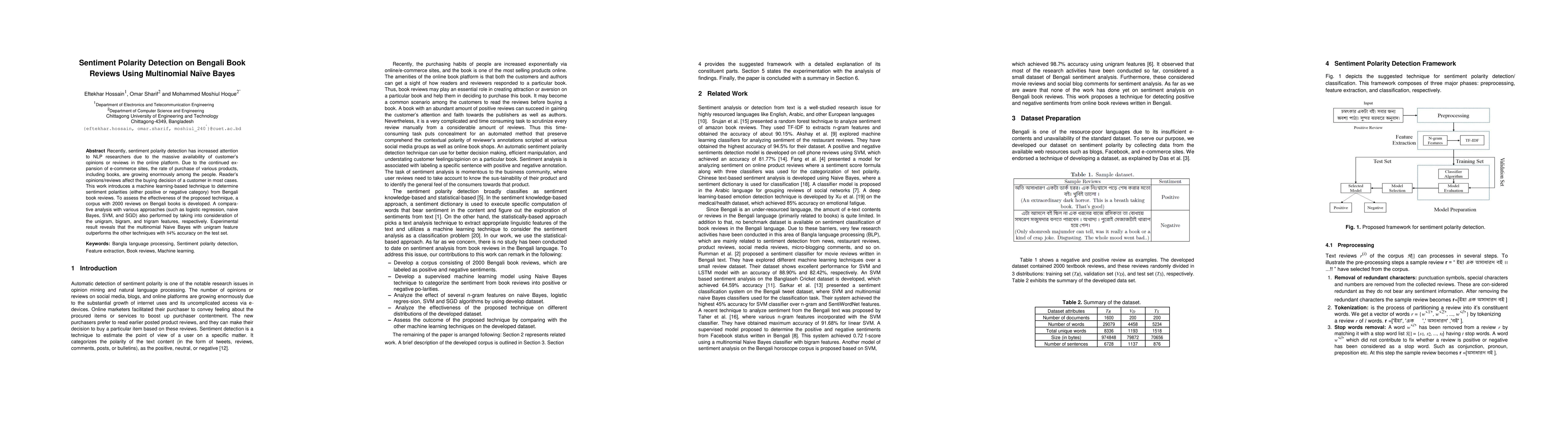 This paper proposes a machine learning method using multinomial Naive Bayes to detect sentiment polarity in Bengali book reviews, achieving 84% accuracy. Comparative analysis with logistic regression, SVM, and SGD shows superior performance over other techniques.